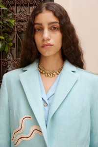 Product Details - Relaxed single-breasted blazer silhouette - Pointed collar and lapel - Artisanal raffia embroidered motifs - Corded button detail - Welt pocket with flap - Refer to size guide for garment measurements - Refer to flat lay product shots for true product colour representation - Composition: 100% Cotton Canvas - For this piece we recommend delicate dry clean only. Size & Fit Model height is 5’9.5in/176.5cm, Bust: 76cm/30in, Waist: 63.5cm/25in, Hip: 87.5cm/34.5in, and wears a size AU6