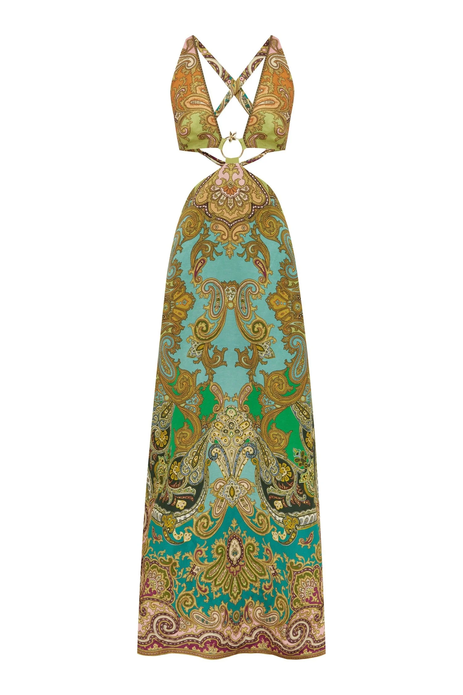 Product Details - Halter neckline - Fitted bodice with gold flower ring detail - Adjustable ties with cross back detail - Cut out waist - Back invisible zipper - Full length slightly A-line skirt - Fully Lined - Refer to size guide for garment measurements - Refer to flat lay product shots for true product colour representation - Composition: 56% European Linen 44% Viscose - For this piece we recommend dry clean only. Size & Fit Model height is 5’11in/180cm, Bust: 81cm/32in, Waist: 61cm/24in, Hip: 90cm/35.5in, and wears a size AU6