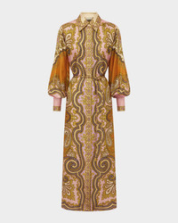 Patterned with a bold mixed paisley print, this dress by ALEMAIS is crafted from pure silk for a luxe, statementmaking shirtdress silhouette Point collar Long balloon sleeves; button cuffs Removable selftie belt Yoked back Hem falls below the knee Concealed placket with selfcovered buttons Silk Imported