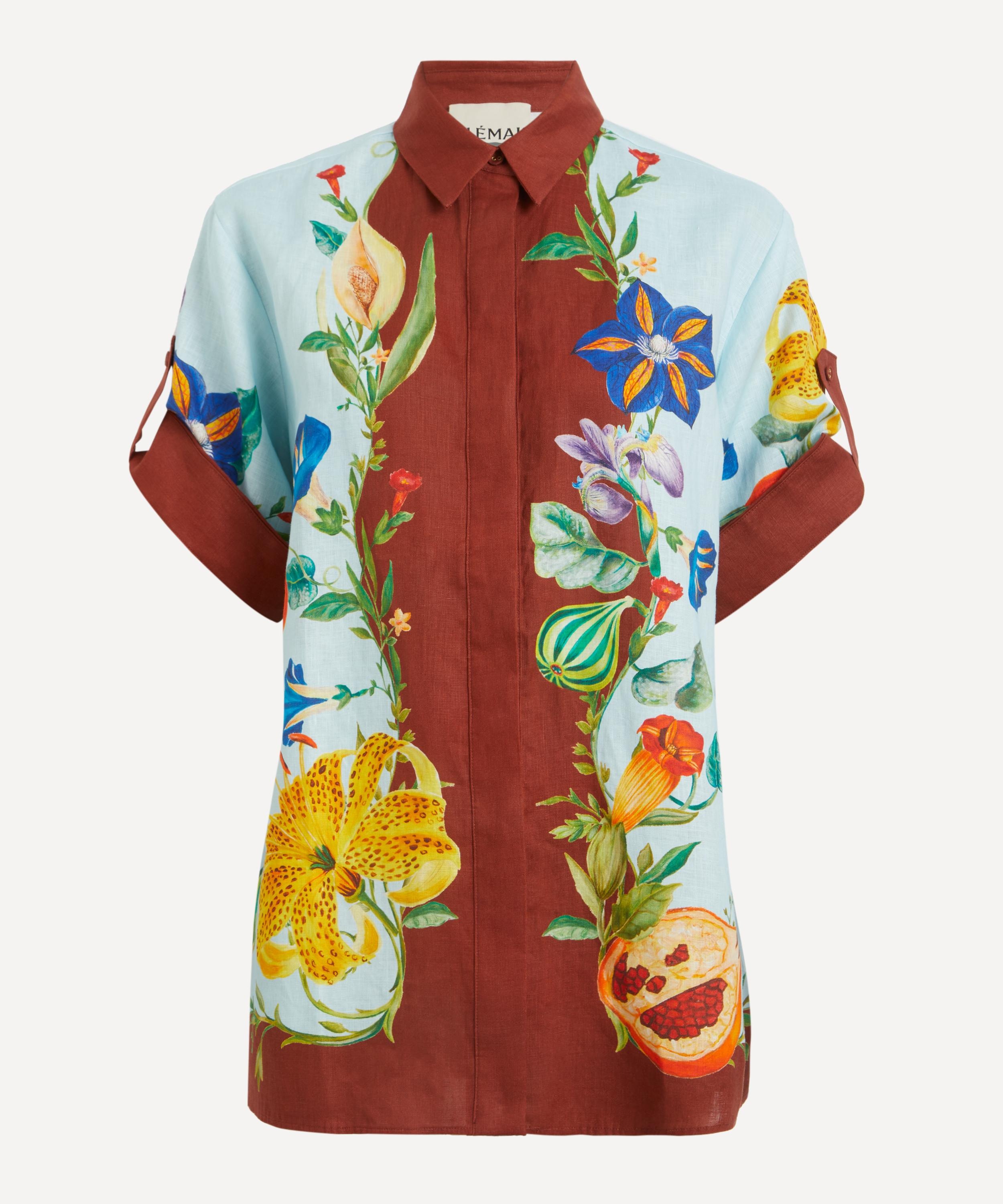 DETAILS Linen shirt Relaxed fit Point collar Dropped shoulders Short sleeves Button tab cuffs Concealed placket with self-covered buttons All-over print SIZE & FIT Model is 174cm/5'8.5"; Chest: 77cm; Waist 59cm; Hips: 86cm and wears a size 8 COMPOSITION & CARE 100% European Flax Linen Hand wash cold