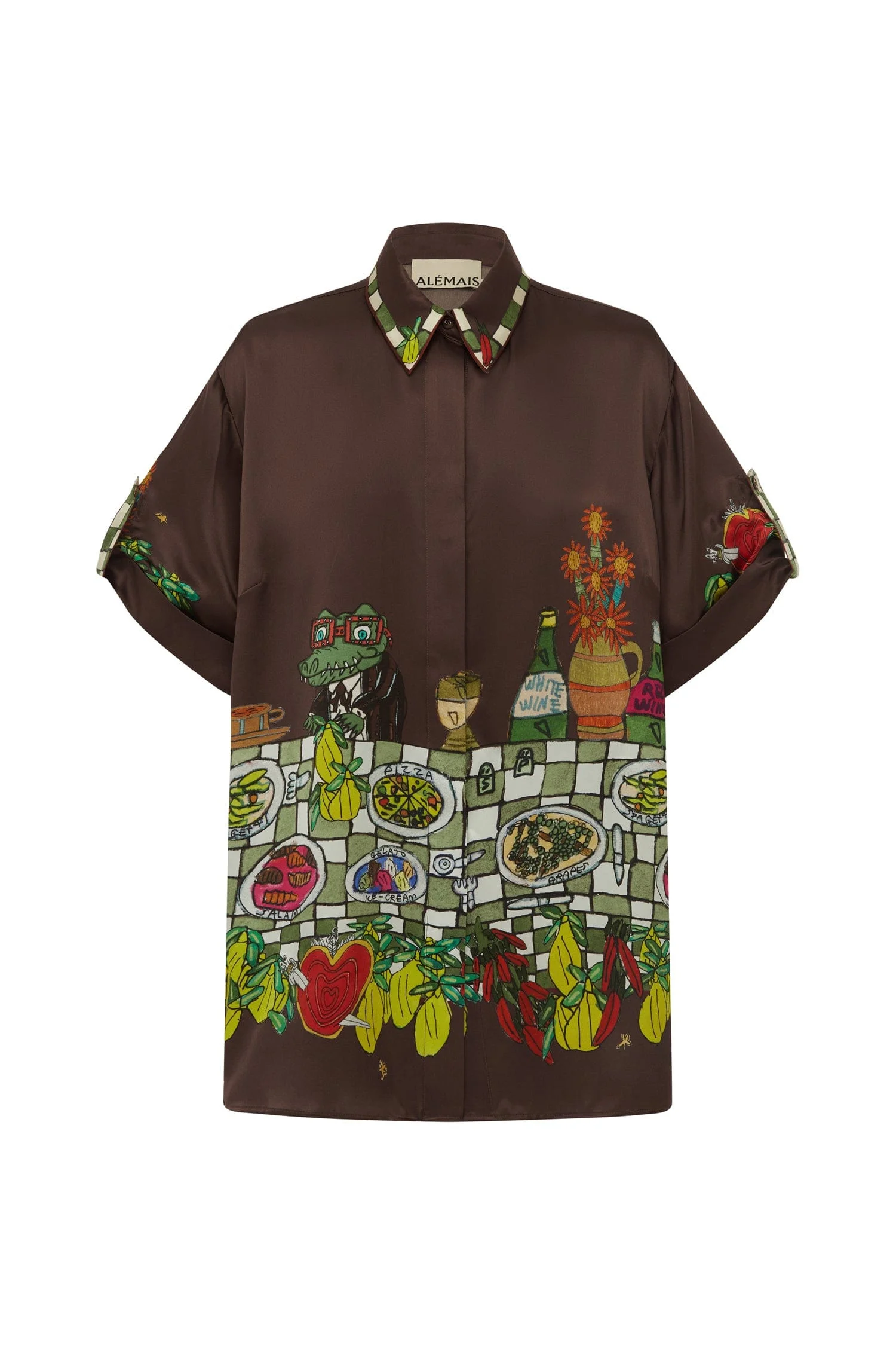 Product Details - Artwork in collaboration with Greg Sindel of Studio A - Pointed collar and stand - Rolled sleeve hem with tabs - Concealed placket with self-covered buttons - Refer to size guide for garment measurements - Refer to flat lay product shots for true product colour representation - Composition: 100% Silk Satin Sandwash - For this piece we recommend dry clean only. Size & Fit Model height is 5’9in/175cm, Bust: 86cm/34in, Waist: 66cm/26in, Hip: 89cm/35in, and wears a size AU8