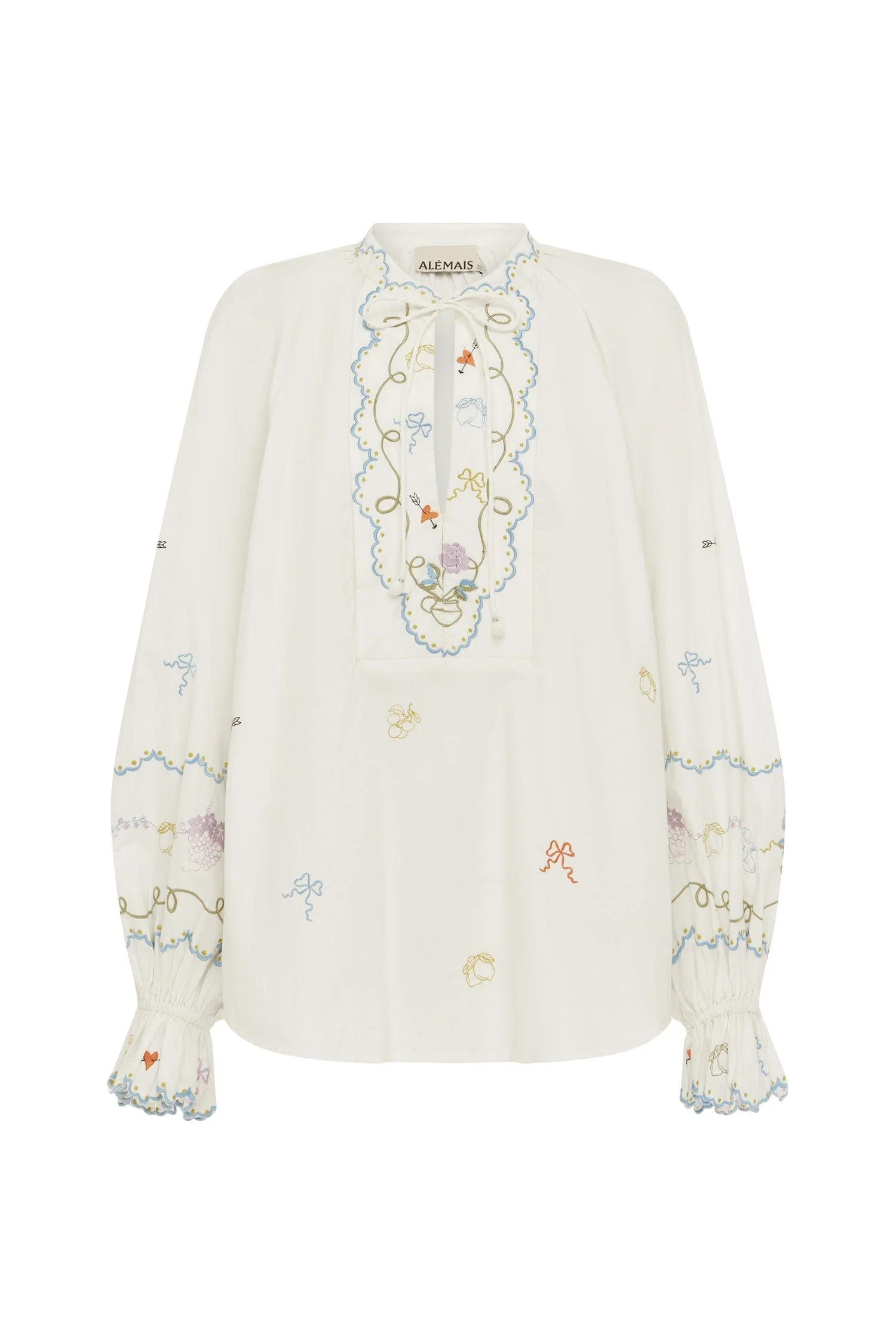 Product Details - Relaxed blouse silhouette - Embroidered motifs - Collar stand with ties at neck - Puff sleeve with elasticated ruffle cuff - Refer to size guide for garment measurements - Refer to flat lay product shots for true product colour representation - Composition: 100% Organic Cotton Poplin - For this piece we recommend a cold hand wash. Size & Fit Model height is 5’11in/180cm, Bust: 81cm/32in, Waist: 61cm/24in, Hip: 90cm/35.5in, and wears a size AU6