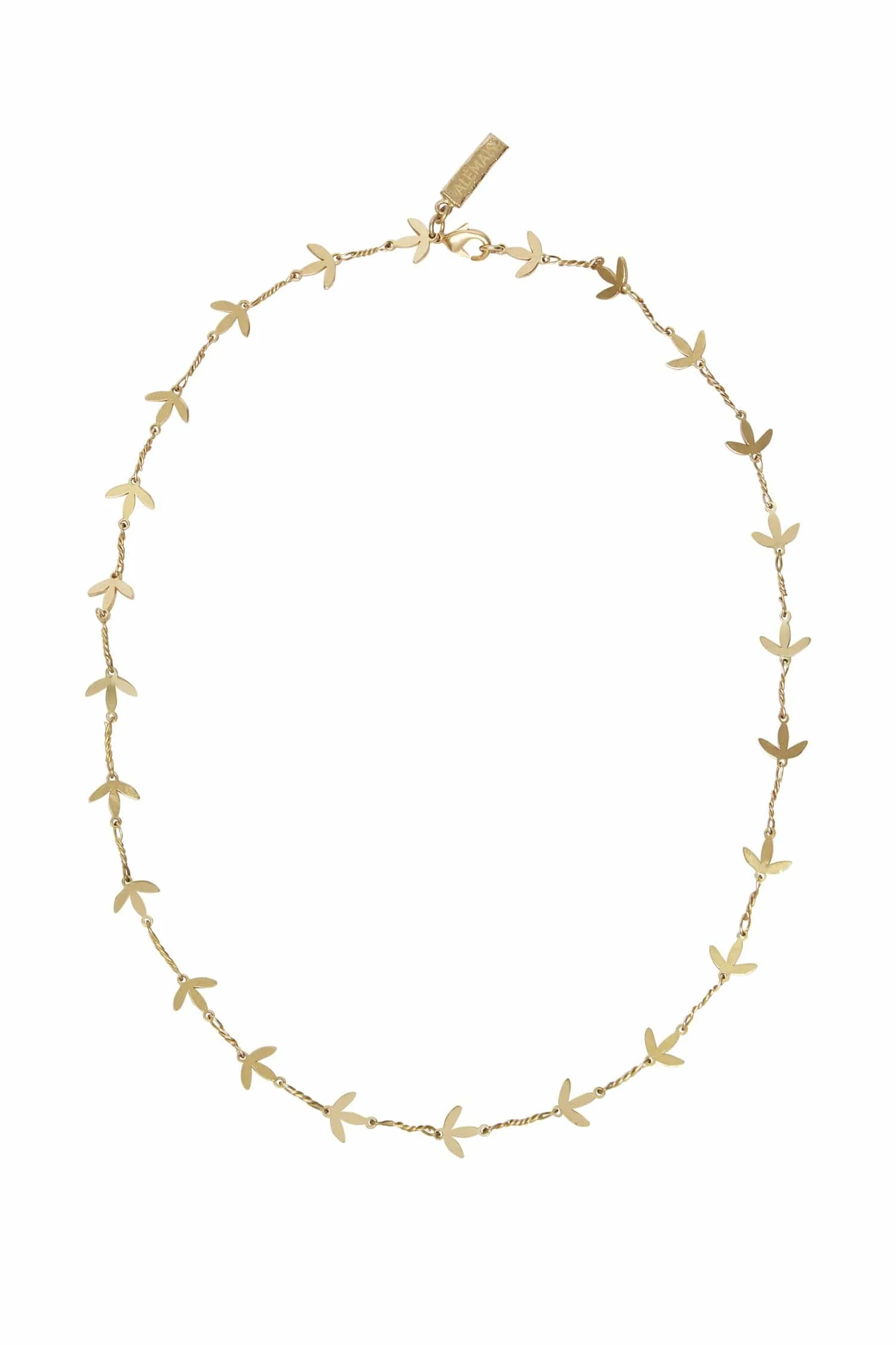 Product Details - Mini leaf and twist chain necklace - Branded rectangular plaque at lobster clasp closure - Handmade in Indonesia - Refer to flat lay product shots for true product colour representation - Composition: 100% Nano Plated Brass - Weight: 25g To care for your piece, we recommend to: - Avoid any impact. - Avoid contact with water or any other source of humidity. - Avoid contact with perfumes and lotions. - Store pieces in their Alemais pouch, away from direct sunlight and heat. - Use a soft, dry cloth to polish. Size & Fit Dimensions: 39cm length