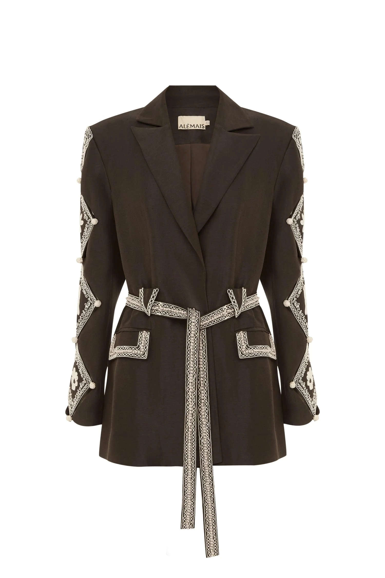 Product Details - Artwork in collaboration with Laurence Leenaert - Fitted single-breasted blazer silhouette - Pointed collar and lapel - Artisanal corded embroidery - Diamond-cut panelling on sleeve - Corded self-belt and belt loops - Welt pocket with flap - Refer to size guide for garment measurements - Refer to flat lay product shots for true product colour representation - Composition: 70% Linen 30% Silk - For this piece we recommend delicate dry clean only. Size & Fit Model height is 5’9.5in/176.5cm, Bust: 76cm/30in, Waist: 63.5cm/25in, Hip: 87.5cm/34.5in, and wears a size AU6