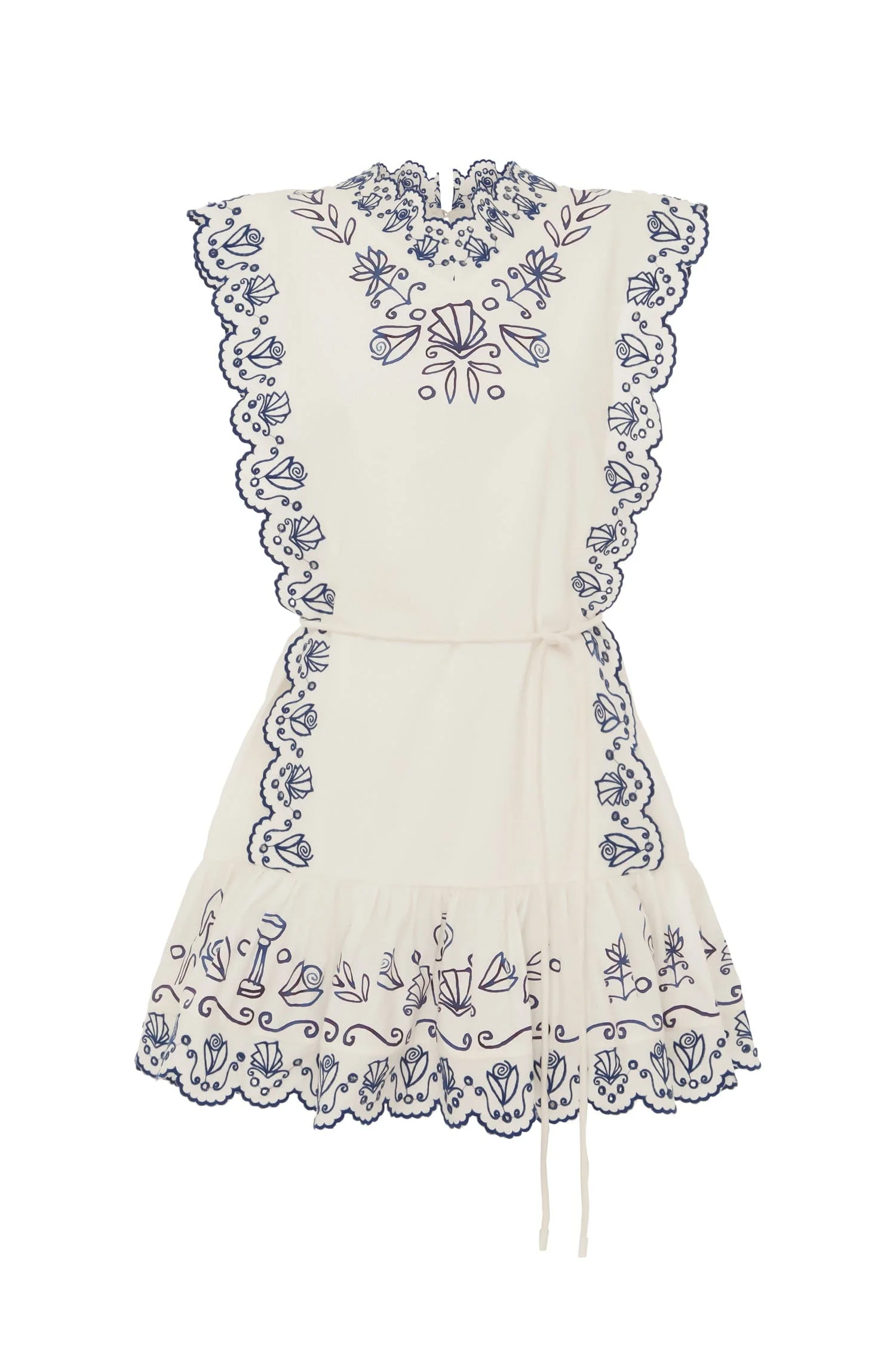 Product Details - Artwork in collaboration with Laurence Leenaert - Relaxed straight mini dress silhouette - Button and loop closure at back neck - Broderie detail at neck, sleeve and hem - Ruffle hem - Self-covered rouleau belt included - Refer to size guide for garment measurements - Refer to flat lay product shots for true product colour representation - Composition: 100% Australian Cotton - For this piece we recommend a cold hand wash. Size & Fit Model height is 5’9.5in/176.5cm, Bust: 75cm/29.5in, Waist: 63cm/25in, Hip: 85cm/33.5in, and wears a size AU6
