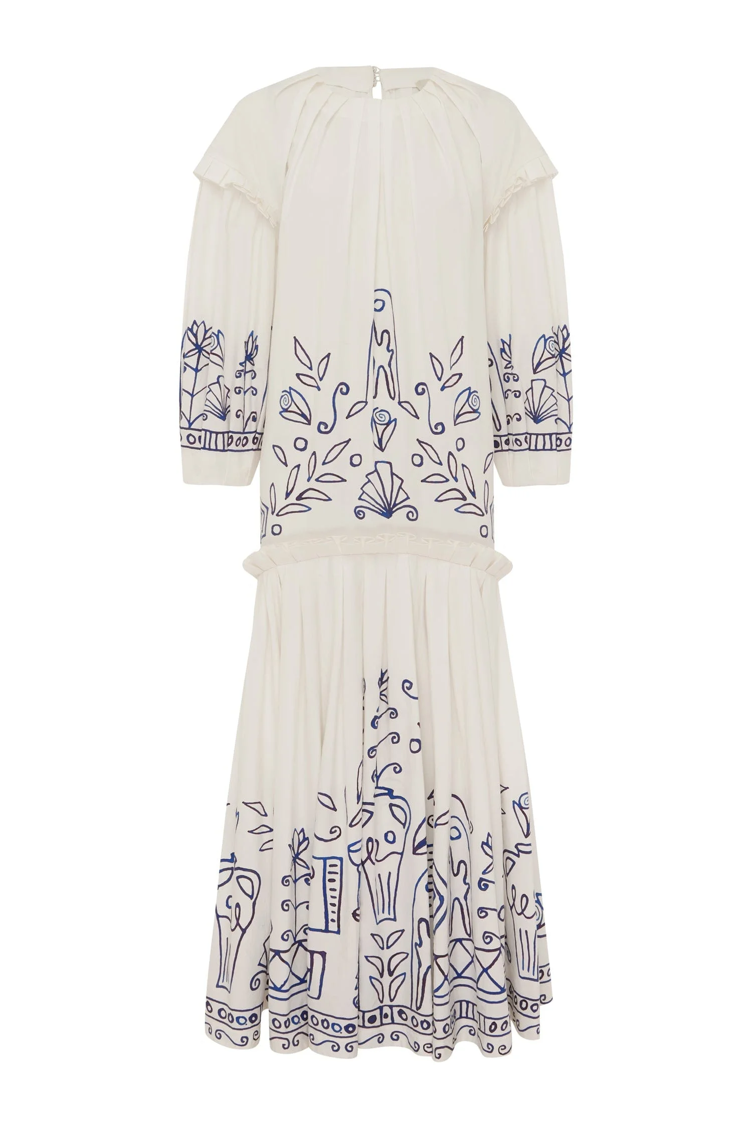 Product Details - Artwork in collaboration with Laurence Leenaert - Relaxed midi dress silhouette - Tucked round neck - Button and loop closure at back neck - Pleated detail at armhole and skirt - Refer to size guide for garment measurements - Refer to flat lay product shots for true product colour representation - Composition: 100% Australian Cotton - For this piece we recommend a cold hand wash. Size & Fit Model height is 5’10in/178cm, Bust: 75cm/29.5in, Waist: 63cm/25in, Hip: 83cm/32.5in, and wears a size AU6