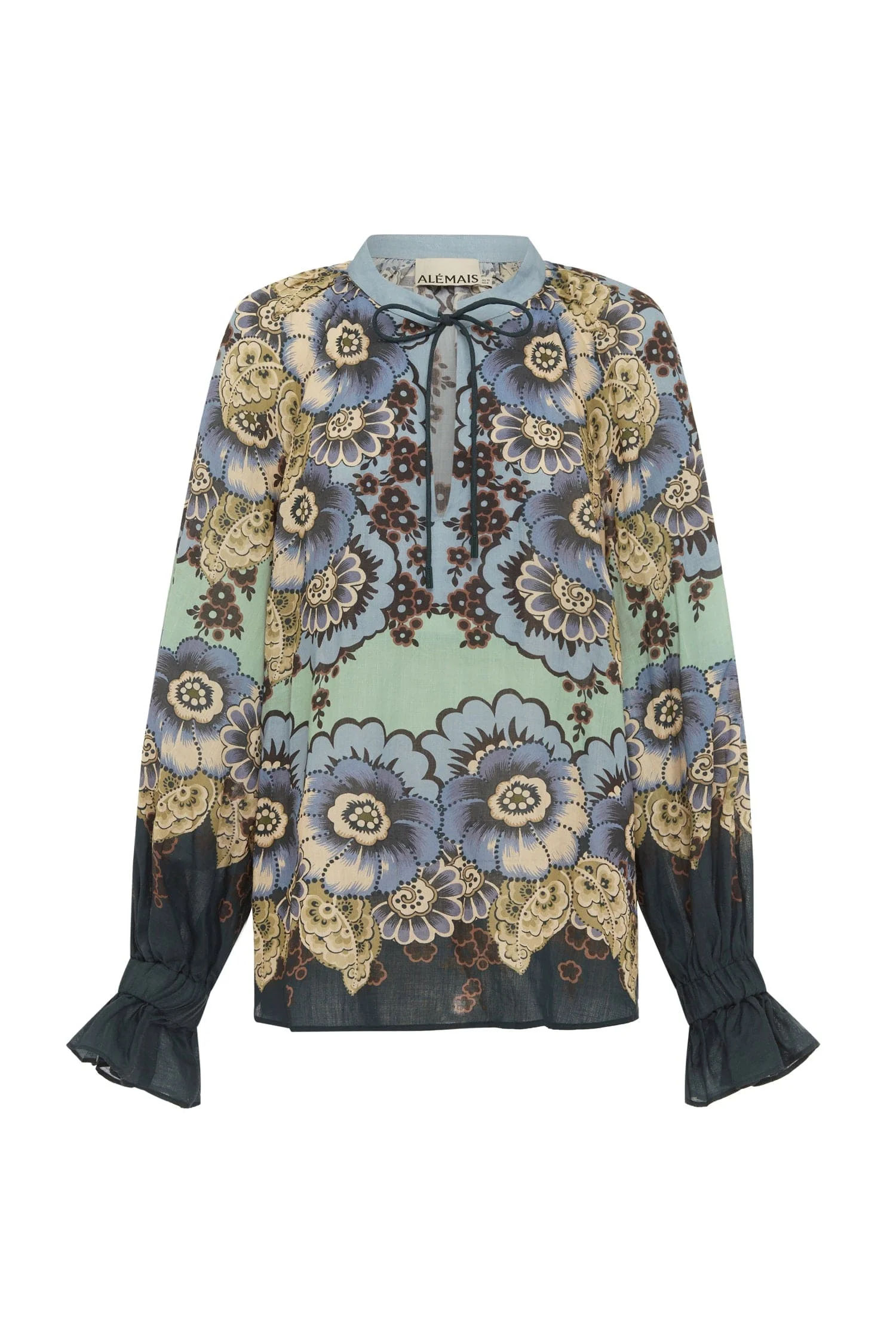 Product Details - Relaxed blouse silhouette - V neck with tie detail - Balloon sleeve - Ruffle cuff - Refer to size guide for garment measurements - Refer to flat lay product shots for true product colour representation - Composition: 70% Cotton 30% Silk - For this piece we recommend dry clean only. Size & Fit Relaxed blouse silhouette V neck with tie detail Balloon sleeve Ruffle cuff Refer to size guide for garment measurements Refer to flat lay product shots for true product colour representation
