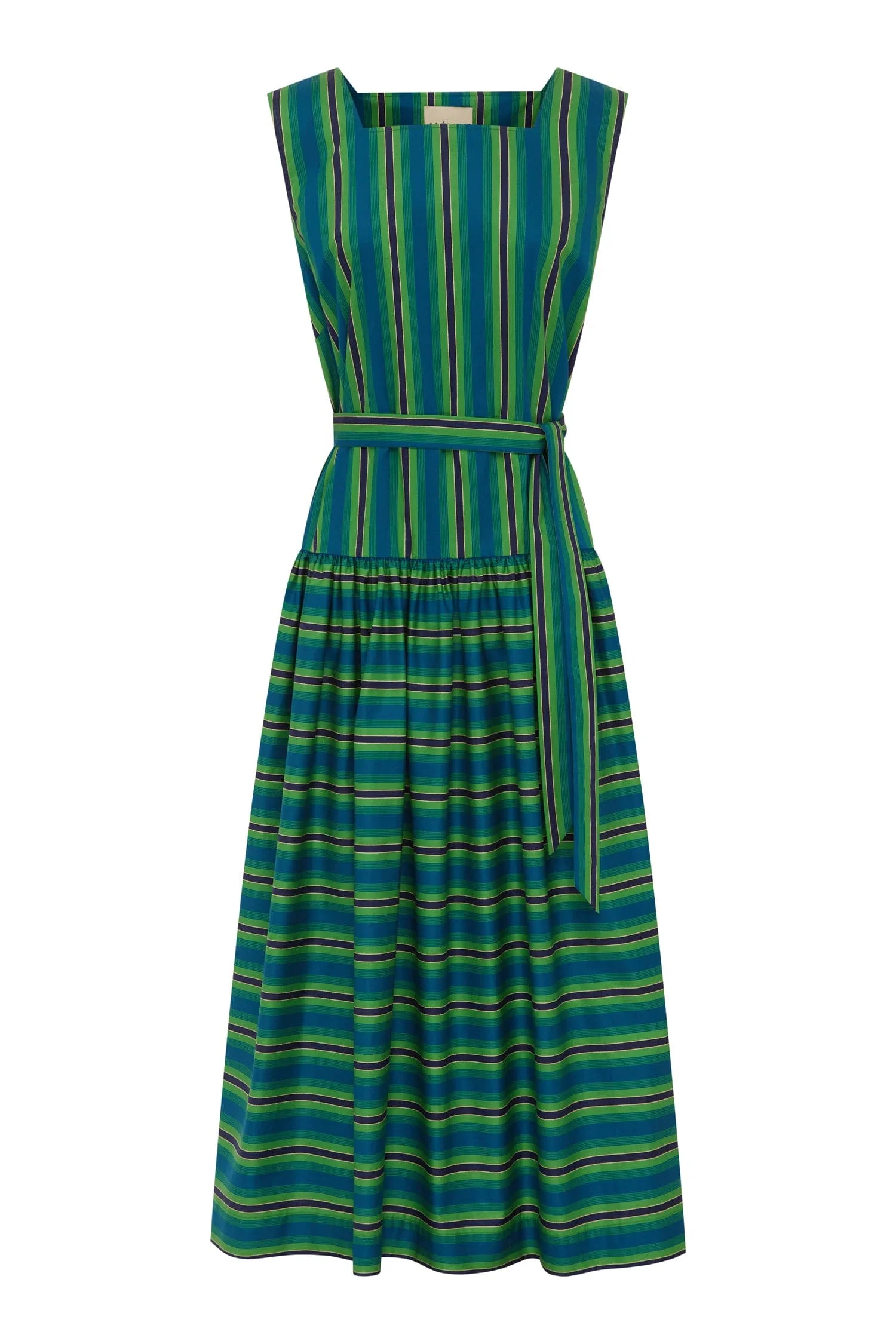 Product Details - Relaxed midi dress silhouette - Square neckline - Gathered drop waist - In seam pockets - Invisible zip fastening at centre back - Self-tie belt - Stripe motif - Refer to size guide for garment measurements - Refer to flat lay product shots for the true product colour representation - Model height is 5’11.5in/181cm, Bust: 82cm/32.5in, Waist: 58cm/23in, Hip: 89cm/35in, and wears a size AU6 - Composition: 100% Organic Cotton Poplin - For this piece we recommend a cold hand wash. Size & Fit Model height is 5’11.5in/181cm, Bust: 82cm/32.5in, Waist: 58cm/23in, Hip: 89cm/35in, and wears a size AU6