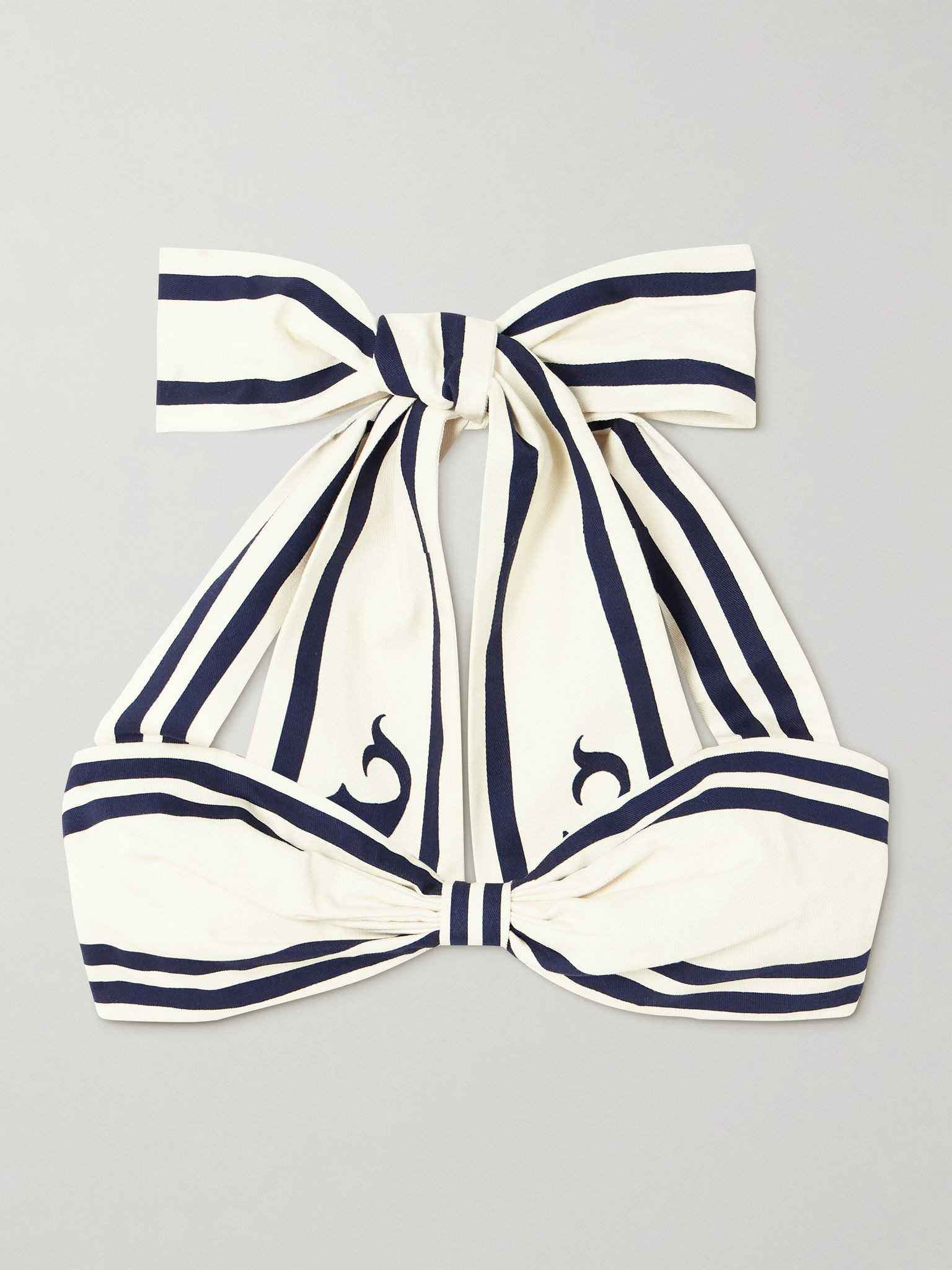 ALEMAIS' 'Marine' bralette is so charming - the Australian brand has such a joyful sense of style. Evoking pin-up styles, it's made from organic cotton with gathered cups and has halterneck ties that secure in an oversized bow. The little fish are such a sweet touch. Size & Fit - Fits true to size, however those who are between sizes should take the smaller size - Designed for a close fit - Partially elasticated at the waist for a flexible fit - Mid-weight, non-stretchy fabric - Model is 177cm/ 5'10" and is wearing a UK 8 Model measurements: - Bust: 85cm/ 33” - Waist: 66cm/ 26” - Hip: 92cm/ 36” Details & Care - Cream and navy organic cotton - Ties at neck, zip fastening through back - 100% organic cotton; lining: 100% cotton - Fully lined - Hand wash
