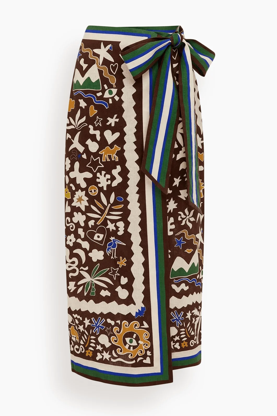 The Alemais Maroc Wrapped Skirt in Multi is a relaxed fit skirt with wrap silhouette. FIT DESCRIPTION MODEL MEASUREMENTS - Fits true to size, take your normal size - Relaxed wrap skirt silhouette - Self-tie detail - Composition: 100% European Linen - For this piece we recommend a cold hand wash. - Mya is wearing a size 6/ 2 US - Bust: 32" - Waist: 25" - Hips: 34" - Height: 5’9"