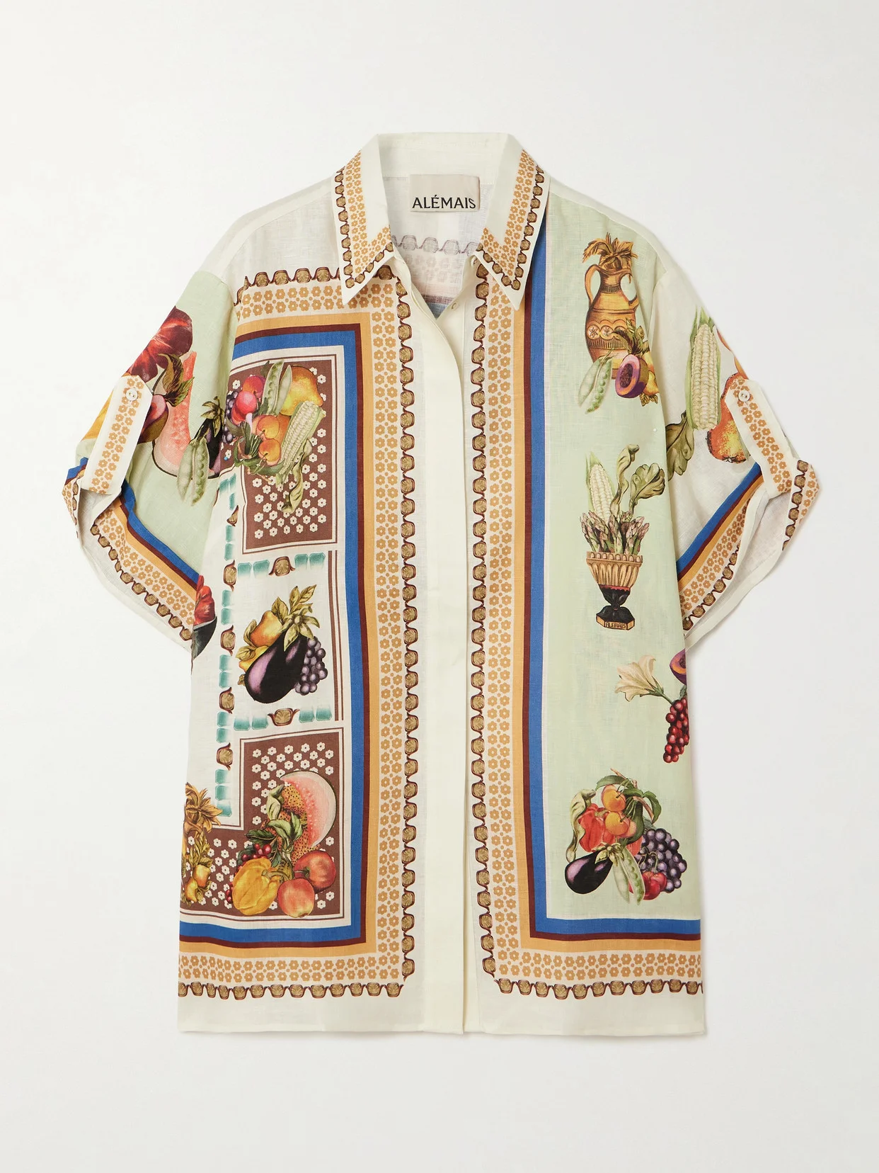 ALEMAIS' 'Mercado' shirt is a celebration of summer's abundance. Cut in a relaxed shape, it's made from breezy linen that's printed with painterly fruits, vegetables and geometric patterns. Wear yours with the matching pants and leather sandals.