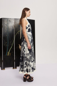 Product Details - Fitted midi dress silhouette - Rounded halter neck with back tie - Invisible zip opening at centre back skirt - Refer to size guide for garment measurements - Refer to flat lay product shots for true product colour representation - Composition: 100% Cotton /95% Cotton 5% Elastane - For this piece we recommend dry clean only. Size & Fit Model height is 5'10.5"in/179cm, Bust: 80cm/31in, Waist: 58.5cm/23in, Hip: 89cm/35in, and wears a size AU8