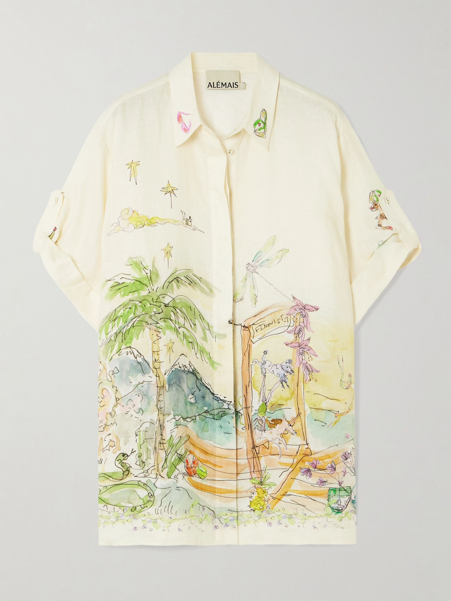 ALEMAIS' shirt is printed with intricate illustrations, dreamt up by Australian artist Anouk Colantoni. It's cut from breezy linen-gauze and has a sharp collar and buttoned tabs on the sleeves. Wear it with loose pants or over a swimsuit. Size & Fit - Fits true to size, take your normal size - Designed for a loose fit - Lightweight, non-stretchy fabric - Model is 180cm/ 5'11" and is wearing a US 6 Model measurements: - Bust: 89cm/ 35" - Waist: 69cm/ 27" - Hip: 97cm/ 38" Details & Care - Multicolored linen-gauze - Partially concealed button fastenings through front - 100% linen - Hand wash or dry clean