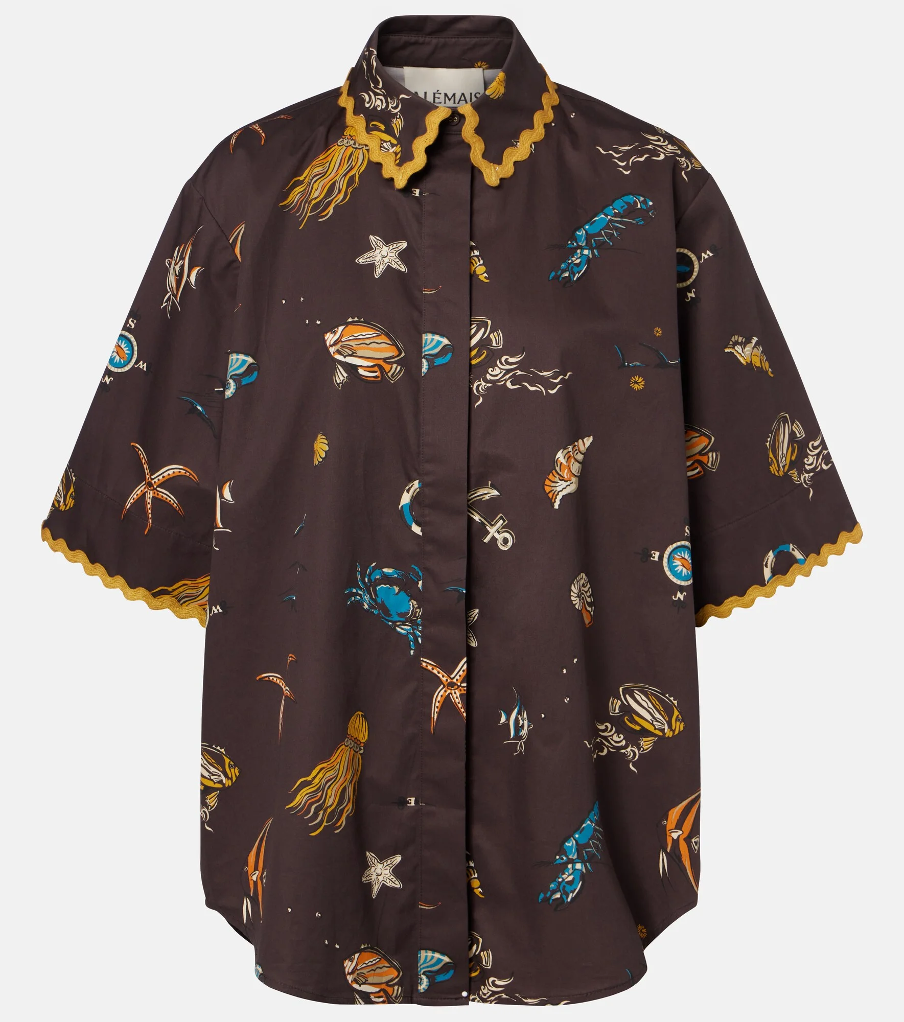 A contemporary brand with an artisanal focus, Alemais celebrates the art of fashion through an eclectic mix of patterns and prints. This bowling shirt is made from cotton and adorned with an all-over print and scalloped, wavy trims. Product Details - Material: 100% cotton (organic) - Care instructions: hand wash - Made in China - Color: brown - Designer color name: Chocolate - Closure: buttoned front - Item number: P01171994 Size & Fit - True to size - Designed for a loose fit - Non-stretchy fabric - Falls below the hip - The model seen in the picture is 178cm-5'10" and wearing a size UK 6