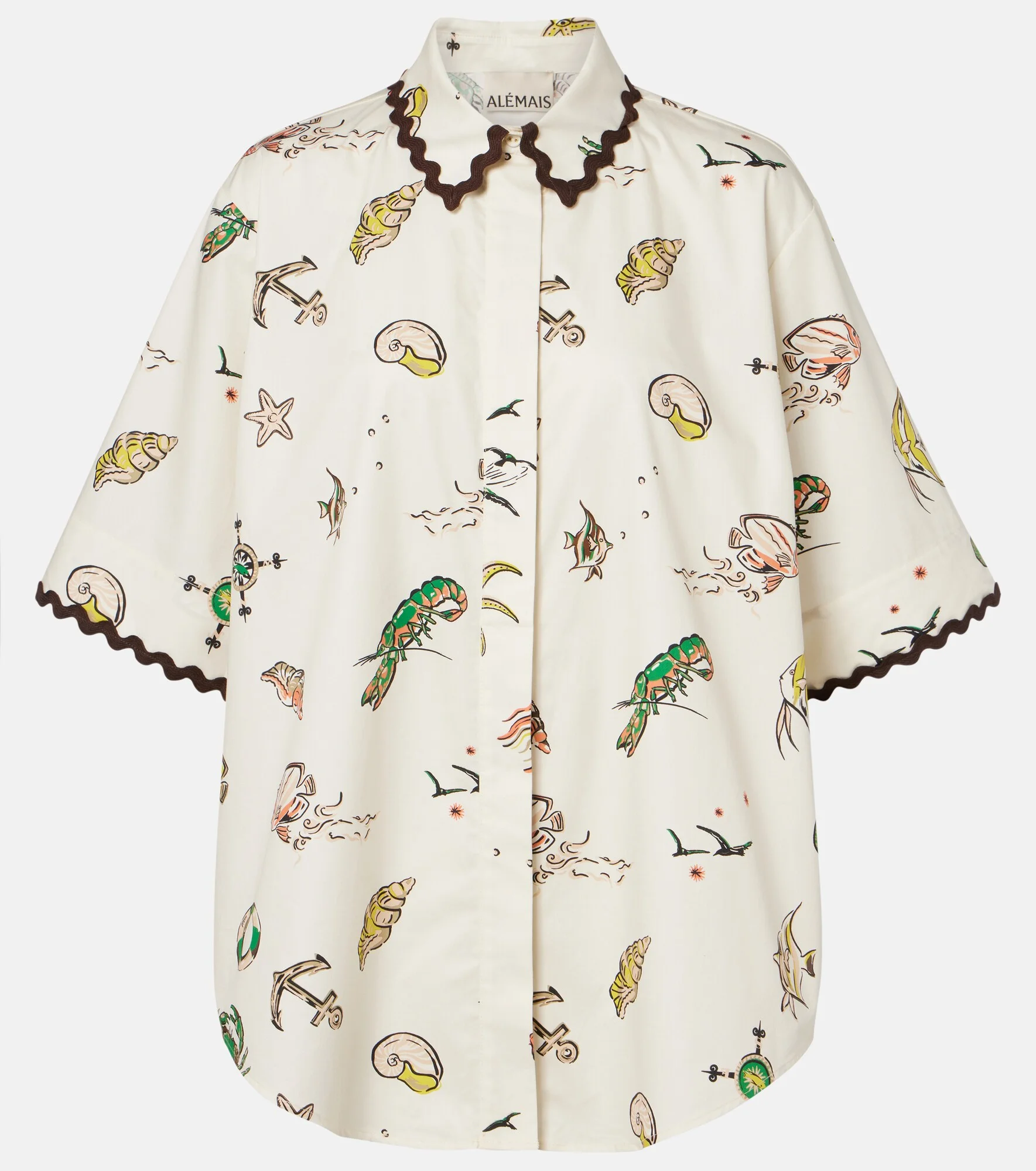 A contemporary brand with an artisanal focus, Alemais celebrates the art of fashion through an eclectic mix of patterns and prints. This cotton shirt features a relaxed, oversized silhouette with contrast scalloped trims, flowy short sleeves, and an all-over sea-inspired print. Product Details - Material: 100% cotton (organic) - Care instructions: hand wash cold - Made in China - Color: beige - Designer color name: Cream - Closure: concealed button placket - Collar: classic (Straight point) - Item number: P01171991 Size & Fit - True to size - Designed for a loose fit - Non-stretchy fabric - Falls below the hip - The model seen in the picture is 178cm-5'10" and wearing a size UK 6