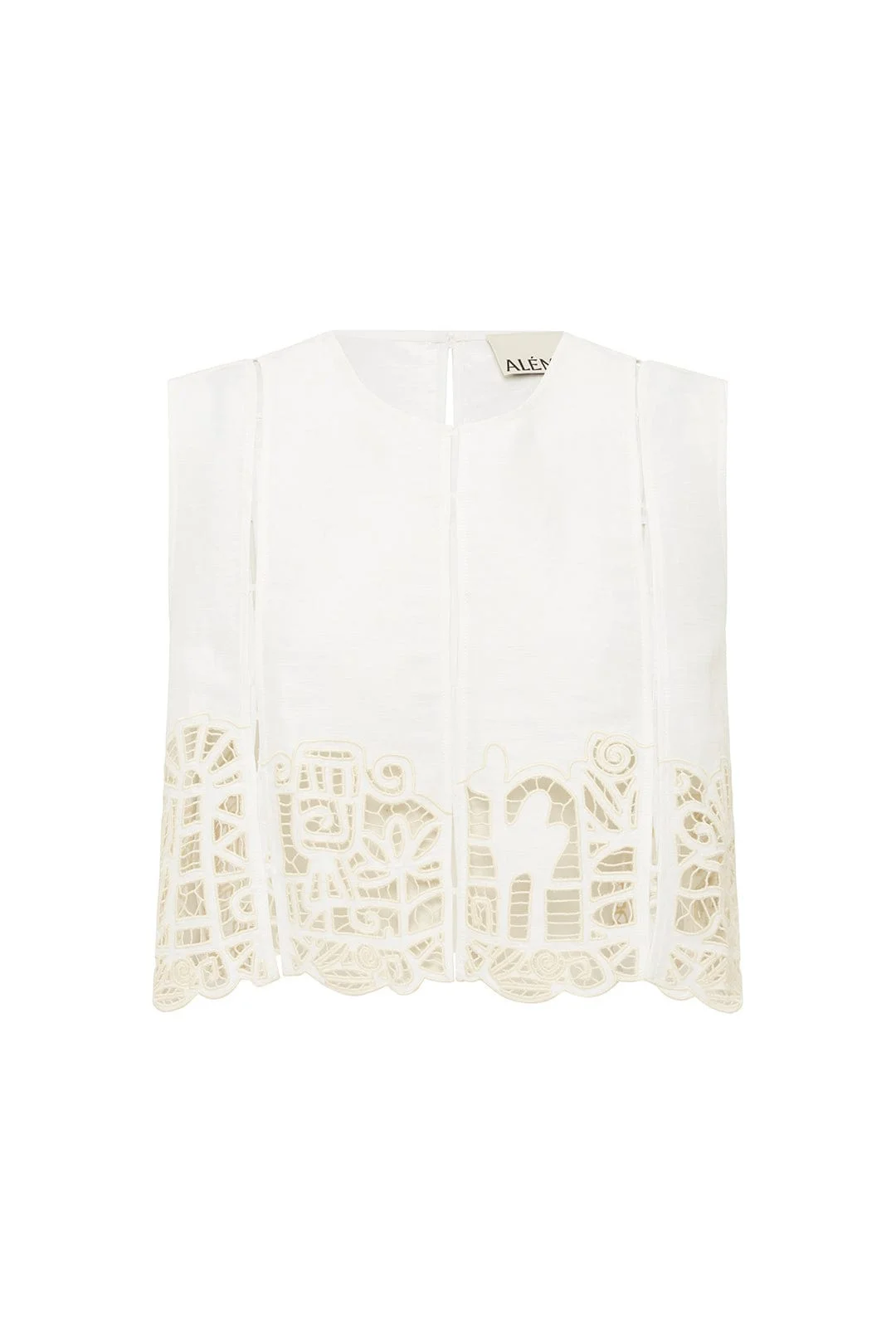 Product Details - Artwork in collaboration with Laurence Leenaert - Relaxed crop top silhouette - Round neck - Artisanal cut-out embroidery - Button and loop closure at centre back - Refer to size guide for garment measurements - Refer to flat lay product shots for true product colour representation - Composition: 66% Linen 34% Viscose - For this piece we recommend delicate dry clean only. Size & Fit Model height is 5’9.5in/176.5cm, Bust: 76cm/30in, Waist: 63.5cm/25in, Hip: 87.5cm/34.5in, and wears a size AU6