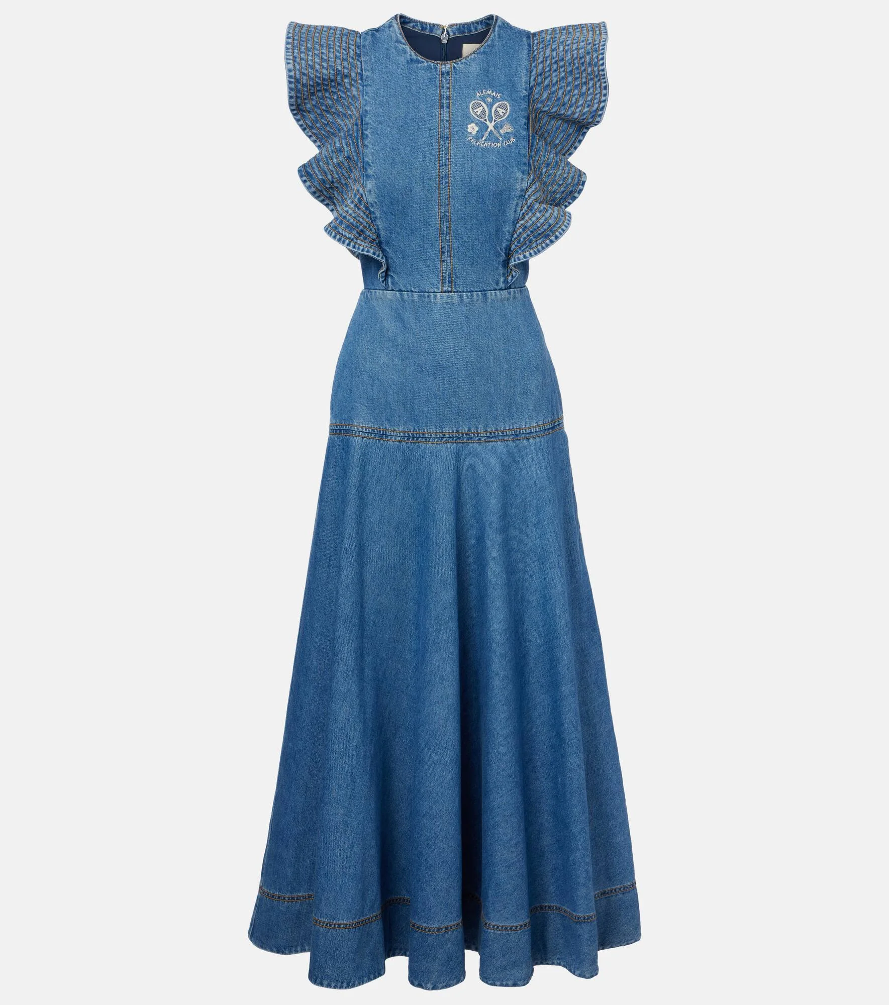 A contemporary brand with an artisanal focus, Alemais celebrates the art of fashion through eclectic style. The Stephi maxi dress is made from denim in a fit-and-flare silhouette with ruffle trims on the bodice. Product Details - Material: 100% cotton - Care instructions: hand wash - Made in China - Designer color name: Light Indigo - Item color: blue - Lining: 80% polyester, 20% cotton - Closure: zipped back - Item number: P01063713 Size & Fit - True to size - Cinched waist - Non-stretchy fabric - The model seen in the picture is 178cm-5'10" and wearing a size UK 6