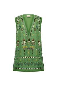 Product Details - Relaxed mini dress silhouette - Deep v-neck - Ricrac trim along neck edge, armholes and hem - Side splits with custom buttons and loop closures at split - Fully lined - Refer to size guide for garment measurements - Refer to flat lay product shots for the true product colour representation - Composition: 54% Linen 28% Cotton 18% Silk - For this piece we recommend dry clean only. Size & Fit Model height is 5’10.5in/179cm, Bust: 81cm/32in, Waist: 61cm/24in, Hip: 88cm/34.5in, and wears a size AU6