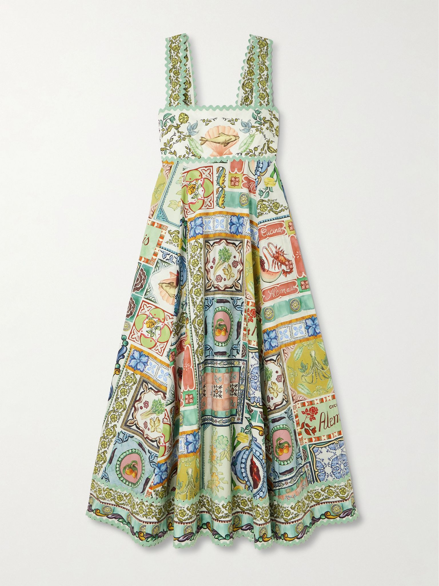 Alemais' uplifting prints will instantly put you in the vacation mood. This 'Tommasina' dress is cut from cotton-poplin with pretty ric rac trims and a voluminous maxi skirt that moves beautifully with you. Wear yours with leather sandals. Size & Fit - Fits true to size, take your normal size - Designed for a slightly loose fit - Mid-weight, non-stretchy fabric - Model is 177cm/ 5'10" and is wearing a UK 8 Model measurements: - Bust: 81cm/ 32" - Waist: 62cm/ 24.5" - Hip: 89cm/ 35" Details & Care - Multicolored cotton-poplin, mint ric rac - Concealed hook and zip fastening at back - 100% cotton - Unlined - Hand wash or dry clean