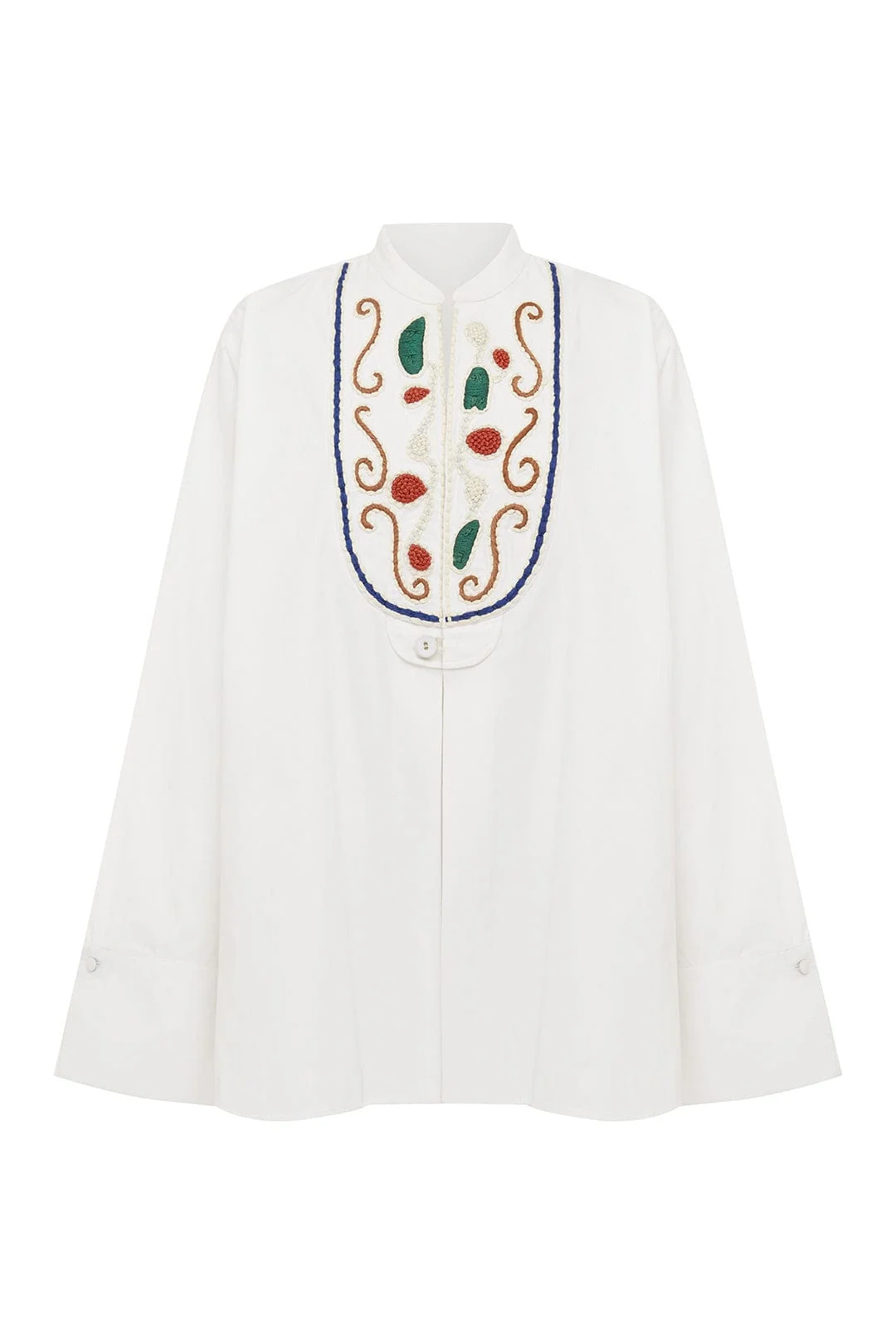 Product Details - Artwork in collaboration with Laurence Leenaert - Relaxed shirt silhouette - Round collar stand - Artisanal raffia embroidered motifs - Tab and corded raffia button at front - Corded raffia cufflinks - Refer to size guide for garment measurements - Refer to flat lay product shots for true product colour representation - Composition: 100% Cotton Poplin - For this piece we recommend delicate dry clean only. Size & Fit Model height is 5’9.5in/176.5cm, Bust: 76cm/30in, Waist: 63.5cm/25in, Hip: 87.5cm/34.5in, and wears a size AU6