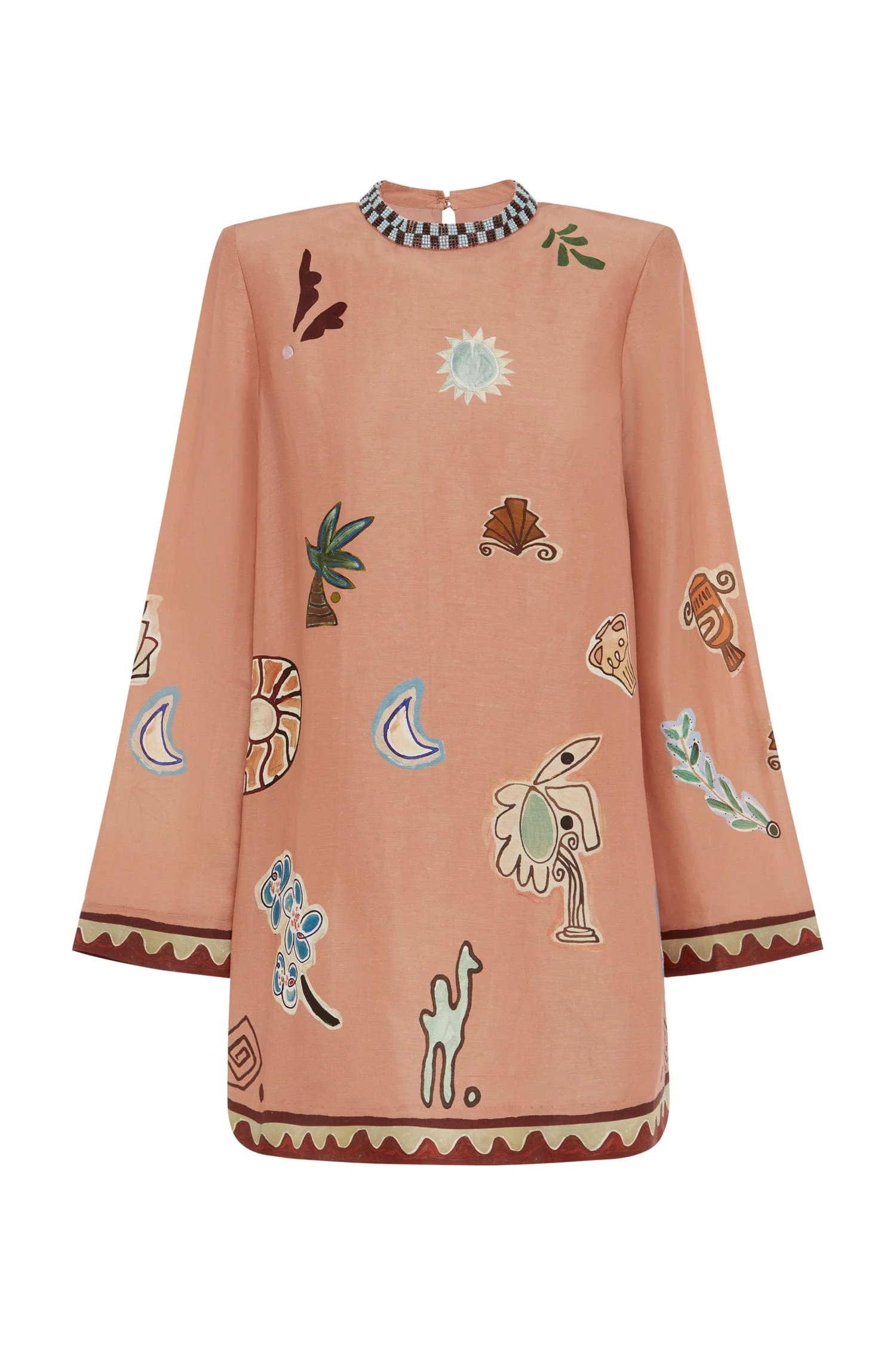 Product Details - Artwork in collaboration with Laurence Leenaert - Straight mini dress silhouette - Beaded round neck collar - Button and loop closure at centre back - Fully lined - Refer to size guide for garment measurements - Refer to flat lay product shots for true product colour representation - Composition: 78% Linen 22% Silk - For this piece we recommend dry clean only. Size & Fit Model height is 5’9.5in/176.5cm, Bust: 76cm/30in, Waist: 63.5cm/25in, Hip: 87.5cm/34.5in, and wears a size AU6