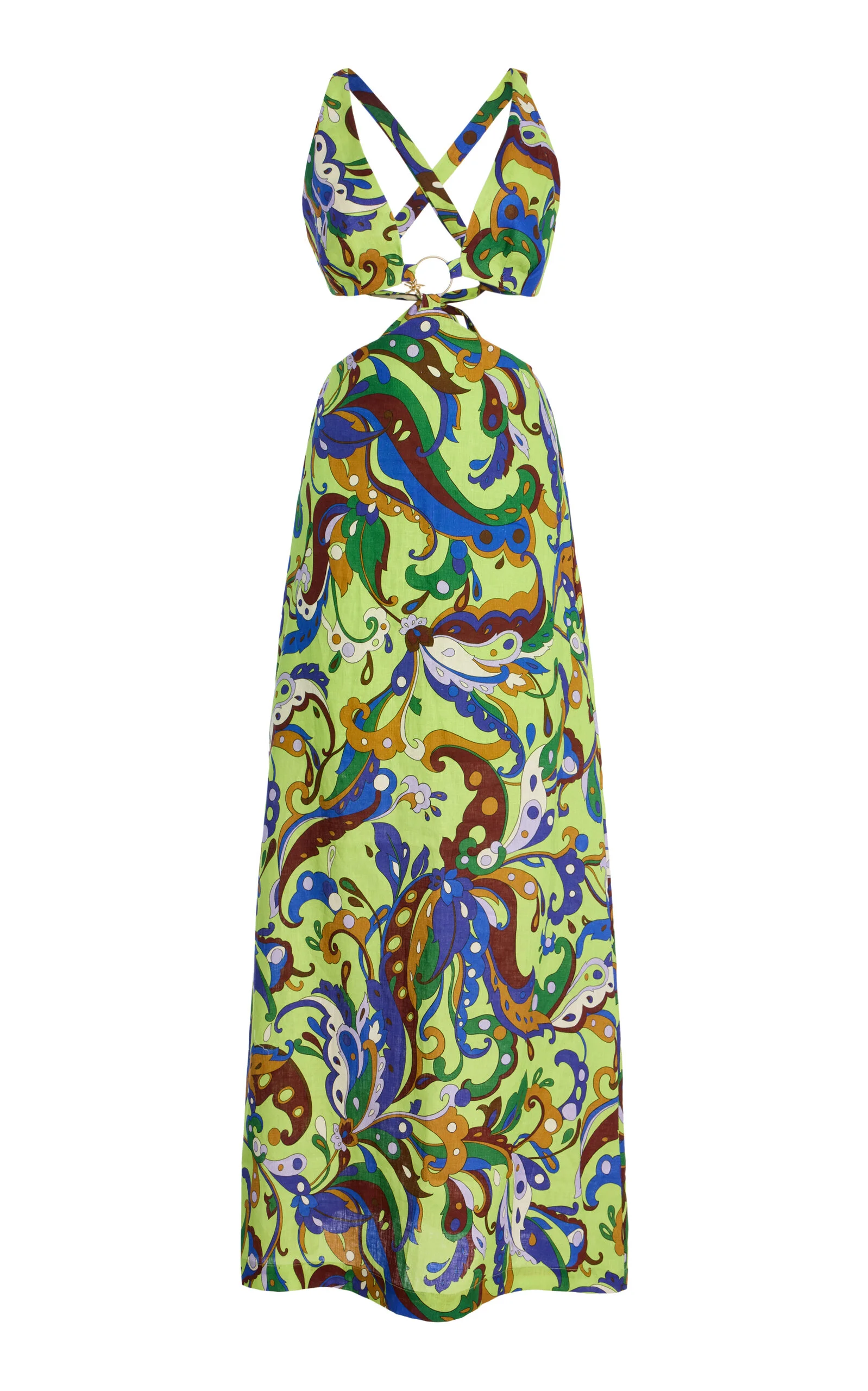 Australian Lesleigh Jermanus continues to deliver a sustainable marriage of femininity and island-ready ease that makes her pieces so covetable. The 'Yvette' features a halter-neck bodice with adjustable cross-over ties at the back and a gold flower ring that connects it to the full-length A-line skirt. PRODUCT DETAILS - Fall '25 - Tie and zip fastening at back - Composition: 100% European flax linen - Designer color: Lime - Dry clean - Imported