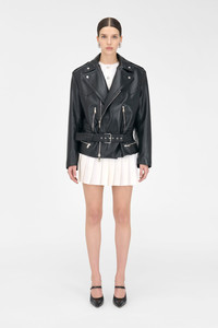 Oversized leather biker jacket Composition 100% leather Lining: 100% viscose Padding: 100% viscose Colour: black Made in Italy Product code: FABX4231 L4631 0900