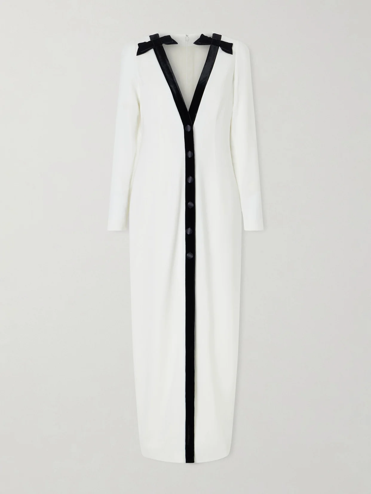 Alessandra Rich brings her signature drama to eveningwear with this striking two-tone dress. Cut from cady, it's traced with plush velvet trims that frame the deep V-neckline while sculptural bows sit neatly at the shoulders for a polished finish. Style yours with statement earrings and sleek heels.