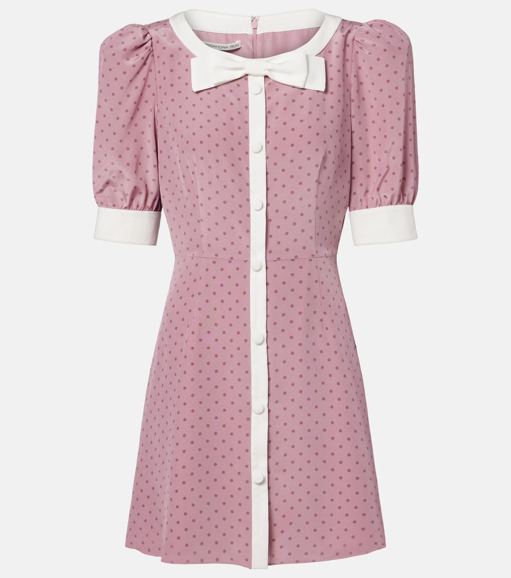 Count on Alessandra Rich for unforgettable styles such as this silk dress, presented in a mini-length silhouette. The design is defined by an all-over polka-dot pattern and a contrast bow at the neck. Product Details - Material: 100% silk - Care instructions: dry clean - Made in Italy - Color: pink - Designer color name: Mauve-Mauve - Lining: 100% polyester - Closure: concealed zipped back - Item number: P01135308 Size & Fit - True to size - Oversized shoulders - Cinched waist - Non-stretchy fabric - The model seen in the picture is 178cm-5'10" and wearing a size IT 40