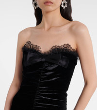 Count on Alessandra Rich for unforgettable looks. Crafted from velvet with delicate lace trims, this strapless gown showcases a front slit and features a ruched finish and a tonal bow at the neckline. Product Details - Material: 75% viscose, 15% silk, 10% elastane - Care instructions: dry clean - Made in Italy - Designer color name: Black - Item color: black - Material II: 100% silk - Material III: 100% polyamide - Material IV: 100% polyamide - Lining: 95% cupro, 5% elastane - Lining II: 80% polyamide, 20% elastane - Closure: concealed zipped back, hook-fastening back - Long vent - Item number: P01103699 Size & Fit - True to size - Strapless - Internal boned corset for support - Fitted - Non-stretchy fabric - The model seen in the picture is 178cm-5'10" and wearing a size IT 40