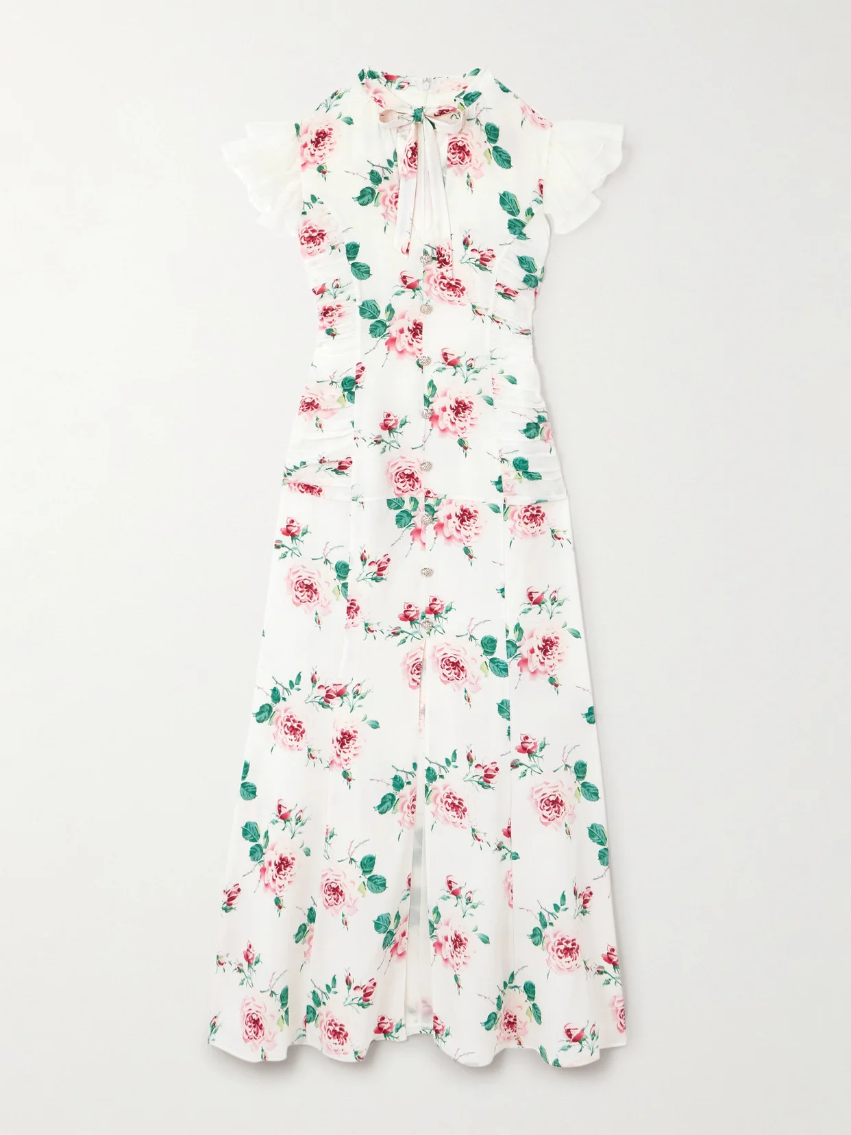 For Spring '24, Alessandra Rich combines feminine floral motifs with sultry silhouettes. This midi dress is cut from silk that's gathered at the sides and printed with painterly roses. The ruffled silk-organza sleeves, bow ties and sparkly buttons echo the romance of styles from the '30s and '40s.