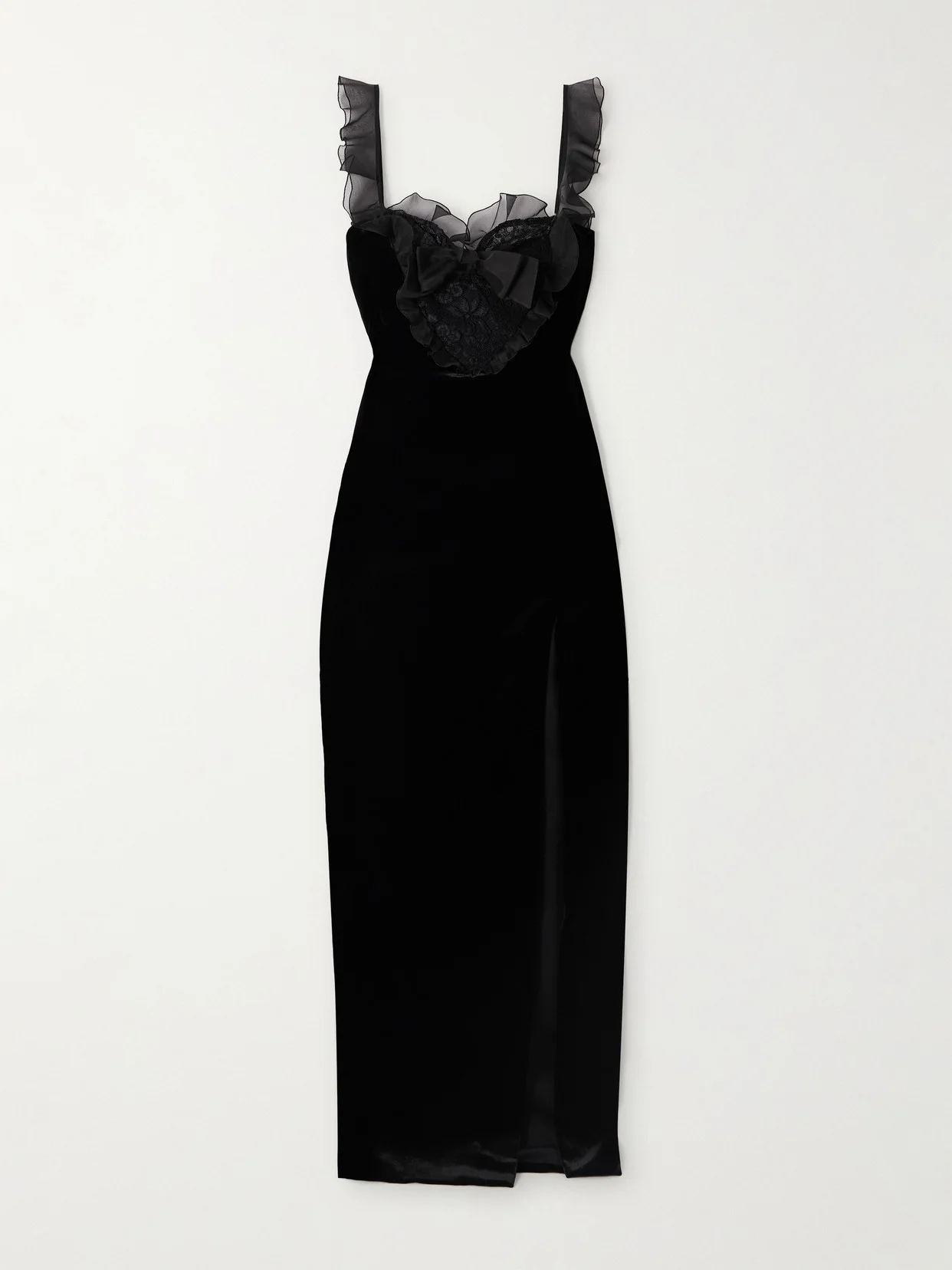 Wander through Alessandra Rich's '20s-inspired fantasy in this gown. Made from plush velvet to contour your figure, it's cut with a thigh-high slit and has a paneled lace bodice adorned with ruffles and a silk bow. Wear yours with a choker or earrings by the brand.