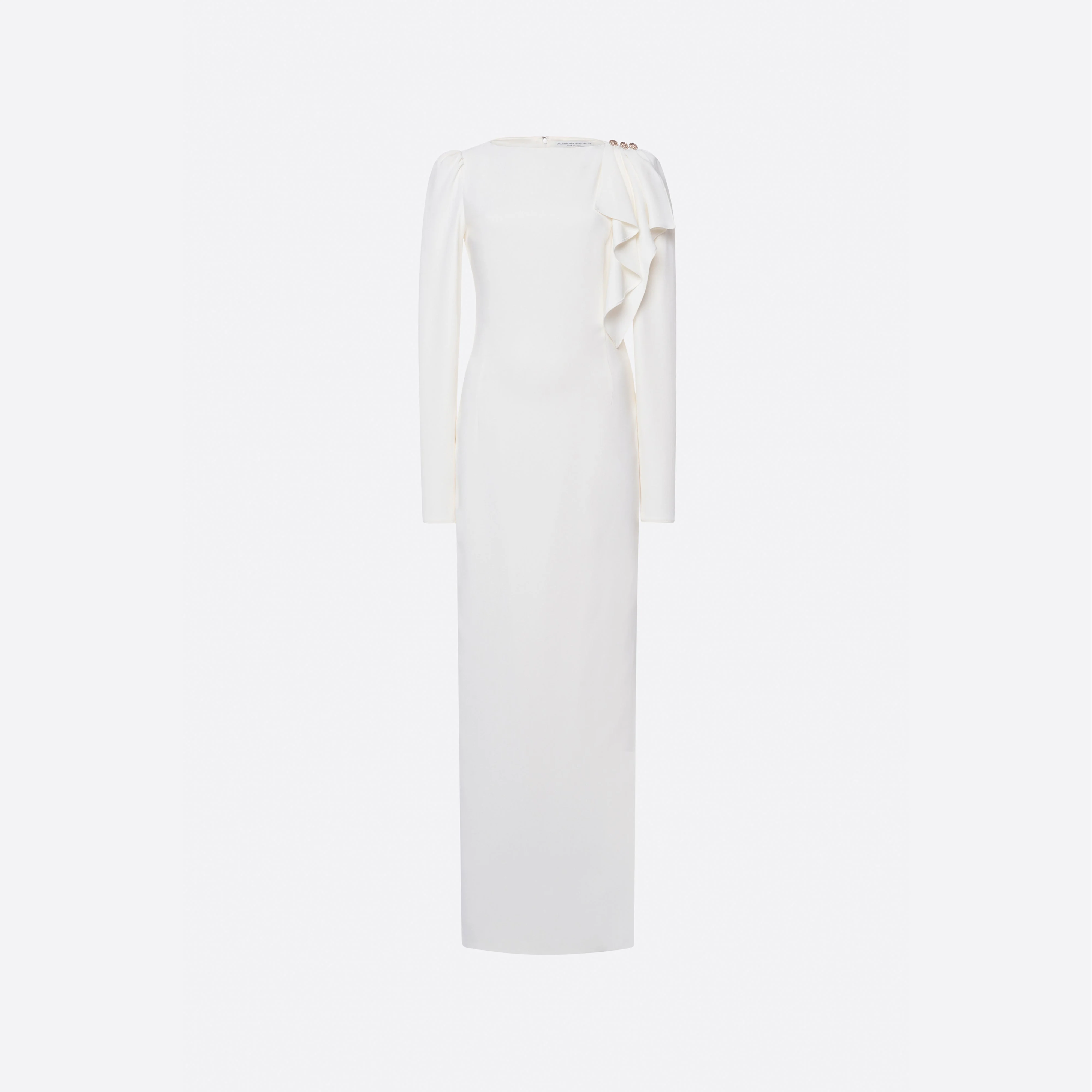 Cady evening dress with volant and side split Composition 64% viscose 33% acetate 3% elastane Lining: 95% cupro 5% elastane Lining 2: 100% polyamide Colour: white Made in Italy Product code: FABX4265 F4692 0822