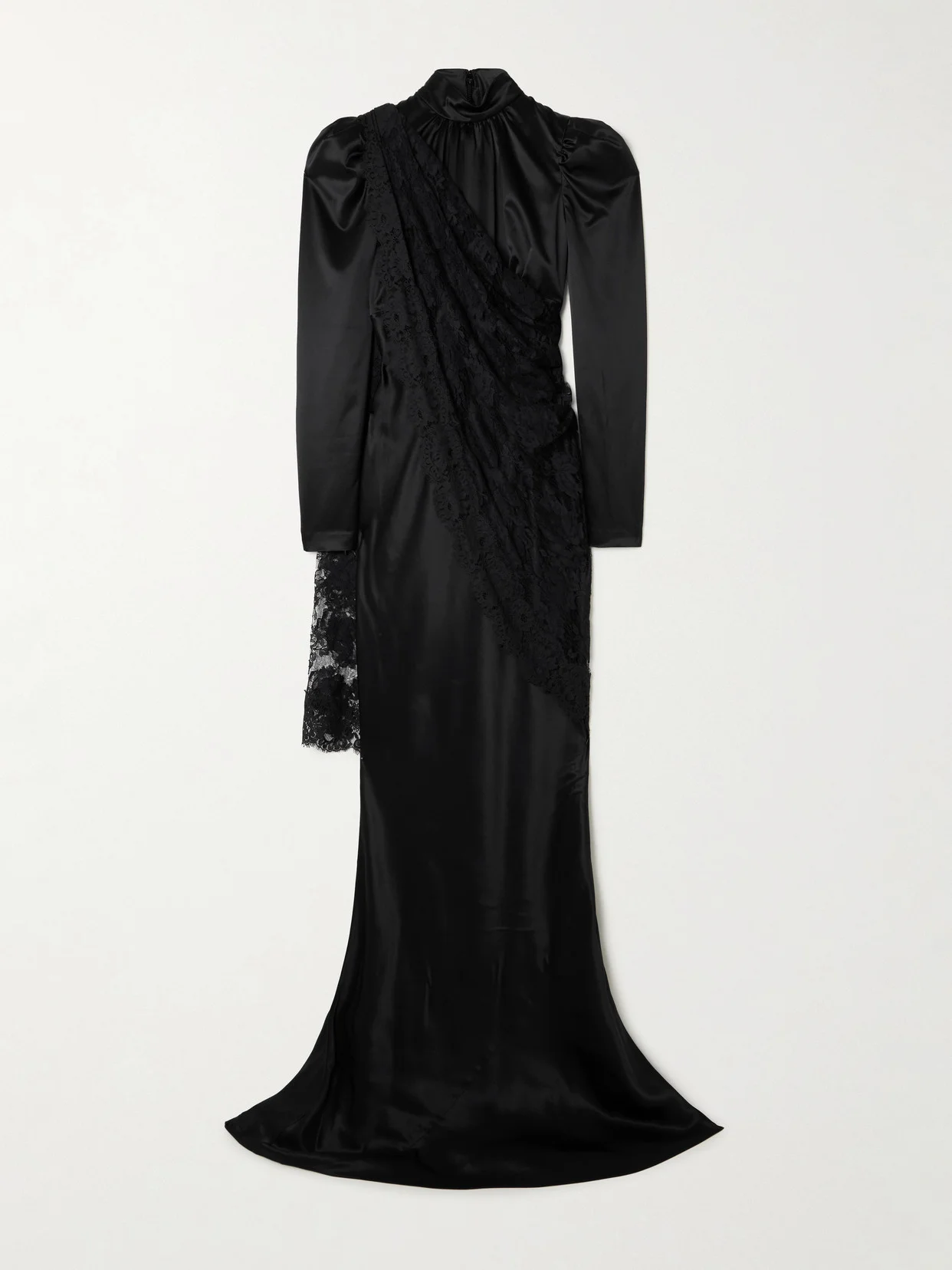 Stars like Dakota Johnson and Lily Collins favor Alessandra Rich's romantic gowns for events and the red carpet. This one is made from lustrous satin with Victorian-inspired puffed sleeves and a lace, cape-effect panel along the high neckline. Complement the floor-pooling length with your highest heels.