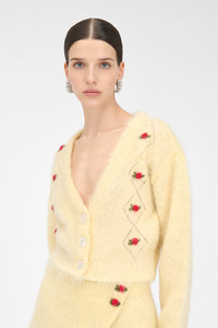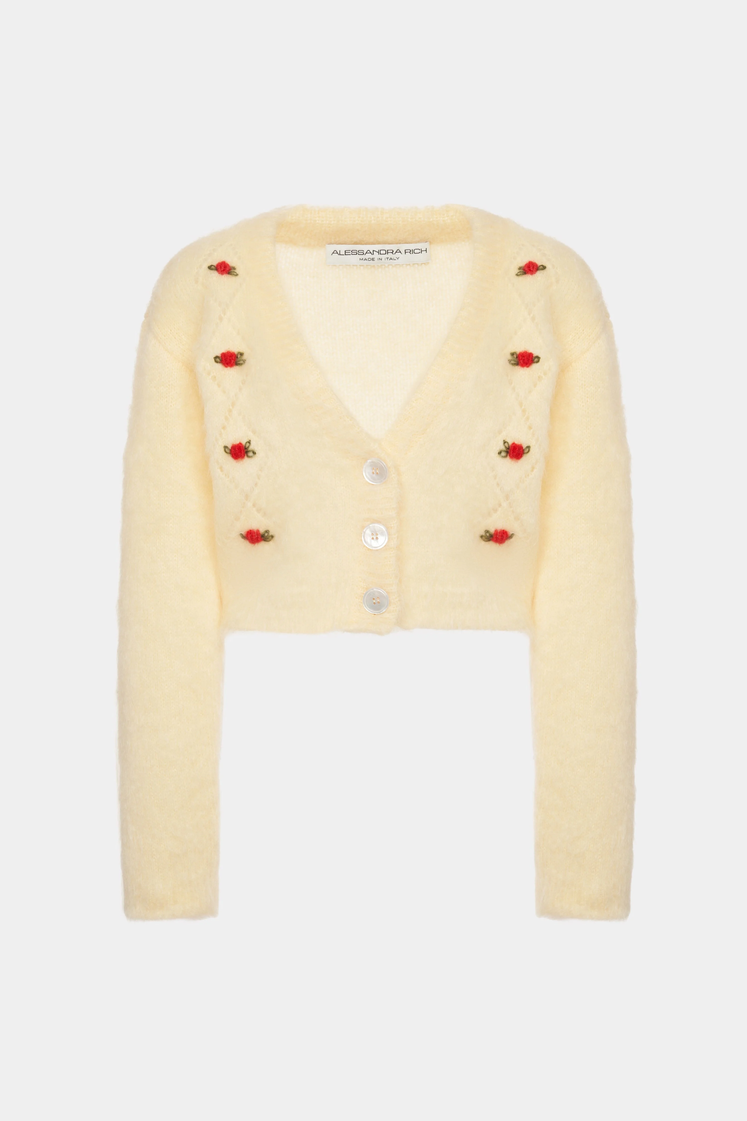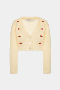 Carded mohair knit cardigan with embroidery Composition 50% mohair 32% polyamide 18% wool Embroidery: 63% mohair 37% polyamide Colour: pale yellow Made in Italy Product code: FABX4183 K4603 9088