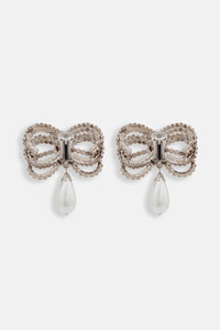 Crystal bow earrings with pendant pearl Materials 20% hypoallergenic toned brass 80% glass Faux pearl: 100% plastic Colour: cry-silver Made in Italy Product code: FABA3256 J0034 0001