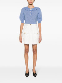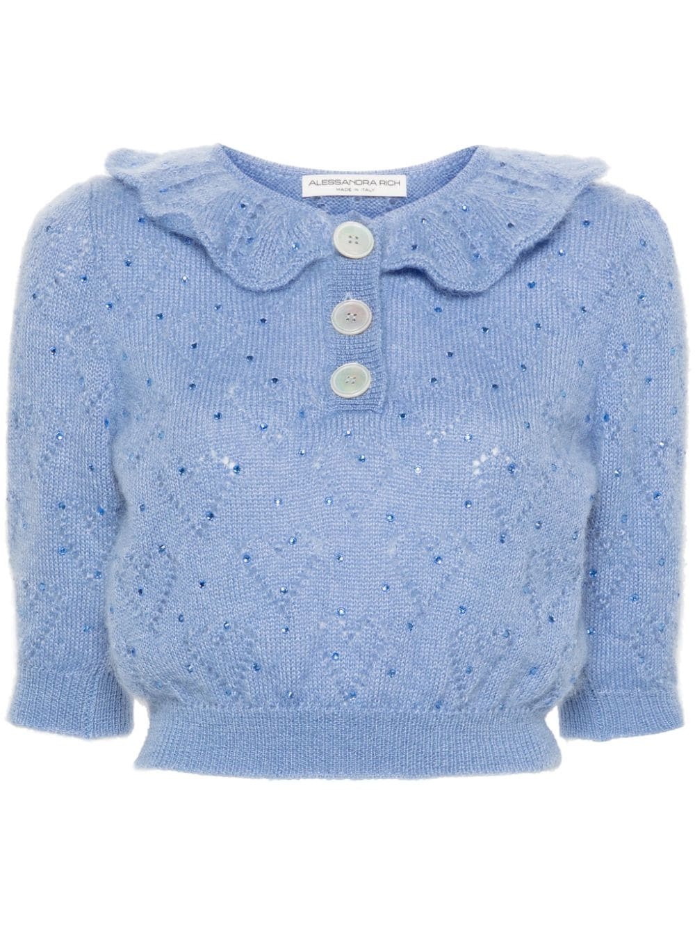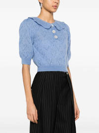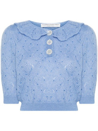crystal-embellished pointelle-knit top Highlights - Cornflower blue - Mohair-wool blend - Pointelle knit - Heart motif - Crystal embellishment - Puritan scallop collar - Short puff sleeves - Cropped - Ribbed cuffs and hem - Unlined - Mother-of-pearl buttons - Short front button fastening Made in Italy Composition Mother of Pearl 100%, Mohair 50%, Polyamide 32%, Wool 18% SIZE & FIT Model measurements Height 5 ft 10 in(1.77 m) Bust/Chest 32.28 in(82 cm) Hips 34.64 in(88 cm) Waist 24.01 in(61 cm) FittingInformation Designed for a relaxed fit, this piece allows for comfort and movement when worn The ribbed hem offers a close, comfortable fit Made with a midweight knit, this piece offers some stretch This piece fits true to size – take your usual size