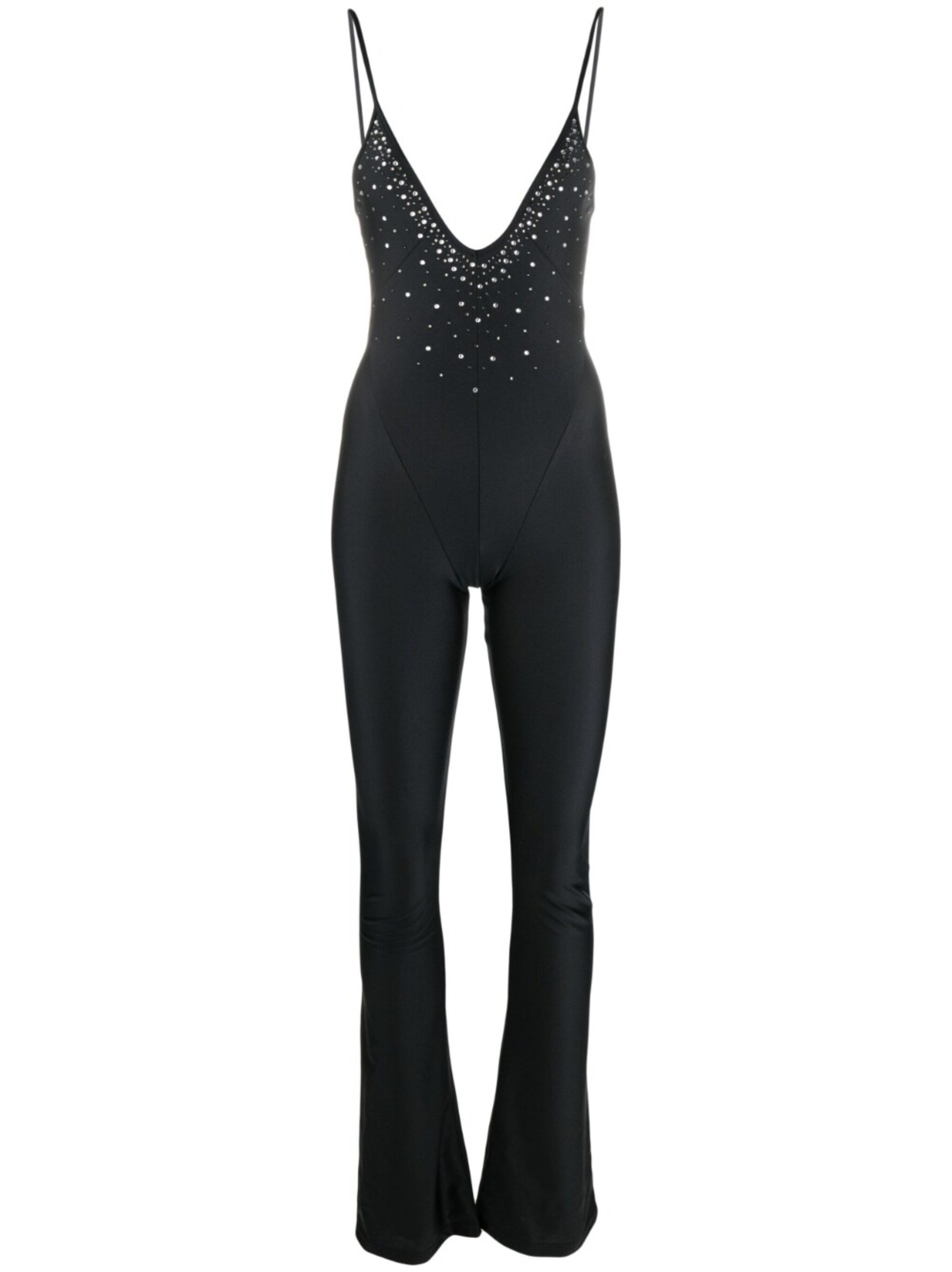 crystal-embellished jumpsuit from ALESSANDRA RICH featuring black, stretch-design, crystal embellishment, plunging V-neck, spaghetti straps and open back. Size & Fit Model Measurements: Bust: 82cm Height: 180cm Hips: 93cm Waist: 63cm