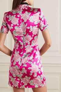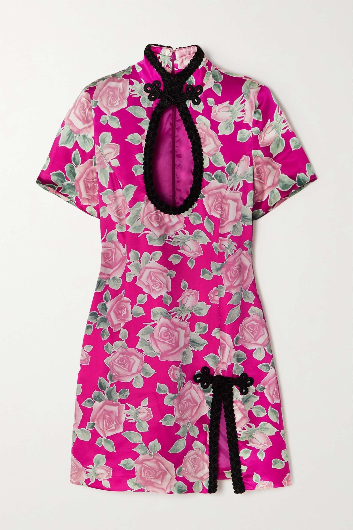 EDITORS'NOTES Alessandra Rich's Fall '22 collection is unapologetically playful and glamorous – you could effortlessly style this mini dress with heels and the label's signature crystal earrings for your next special night. Cut from glossy silk-satin for a slim fit, it's patterned with lush, blooming roses and has braided cord trims tracing the Mandarin collar, cutout bodice and sultry split hem. SIZE & FIT - Fits true to size, take your normal size - Designed for a slim fit - Mid-weight, non-stretchy fabric - Model is 177cm/ 5'10" and is wearing an IT 40 DETAILS & CARE - Tonal pink silk-satin, black cord - Concealed zip fastening along back - 100% silk; trim1: 72% acrylic, 24% nylon, 4% polyester; trim2: 50% acrylic, 50% nylon; lining: 100% cupro - Dry clean