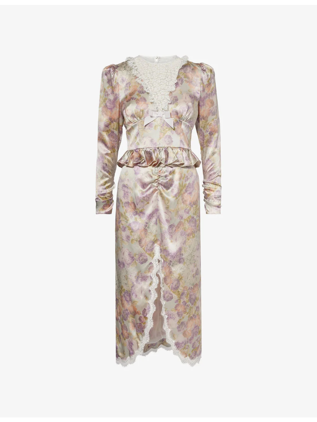 PRODUCT DETAILS - Alessandra Rich silk midi dress - 100% silk; lining 100% polyester - Concealed zip fastening at back - Regular fit, midi length, round neck, sheer lace at v-neckline and trims, bow at front, long sleeves, frilled trim at waistband, all-over floral print, split hem at front, fully lined - Dry clean - Made in Italy - True to size - Size UK 8 : length 50in / 127cm - Model is 5ft 10in/1.78m and wears a size UK 8 - Lightweight, non-stretch Ref: R04550883