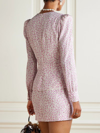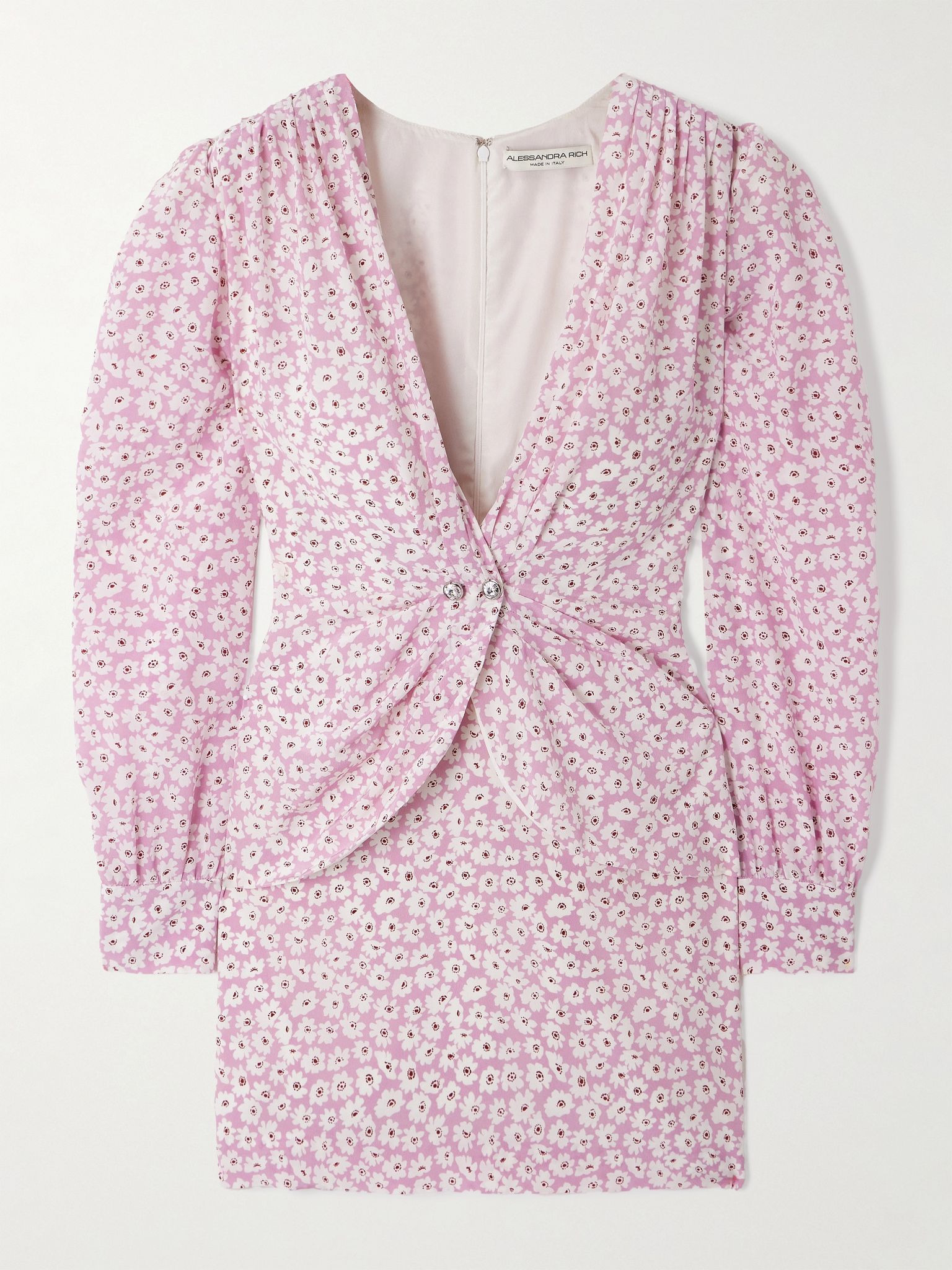 Alessandra Rich's dress is reminiscent of elegant vintage styles. Made from silk crepe de chine, it's patterned with dainty flowers and has a wrap-effect front that cinches with crystal-encrusted buttons. Soft pleats frame the plunging V-neckline so prettily. Size & Fit - Fits true to size, take your normal size - Designed for a slim fit - Internal shoulder pads - Lightweight, non-stretchy fabric - Model is 180cm/ 5'11" and is wearing an IT 40 Model measurements: - Bust: 86cm/ 34" - Waist: 65cm/ 25.5" - Hip: 90cm/ 35.5" Details & Care - Pink, red and white silk crepe de chine - Concealed hook and zip fastening at back - 100% silk - Fully lined - Dry clean