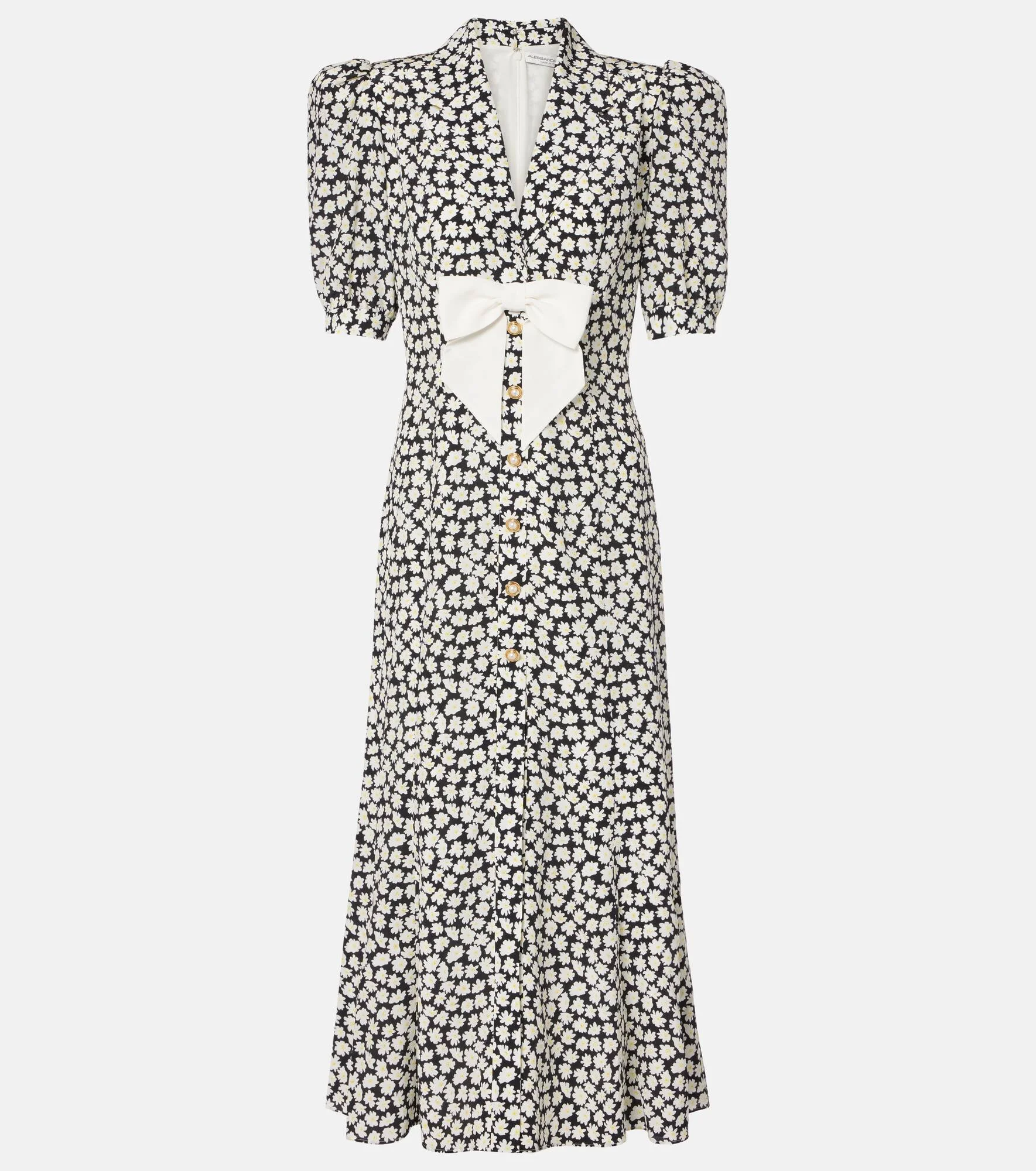 Count on Alessandra Rich for spotlight-stealing looks with feminine flair. Crafted in Italy from pure silk, this midi dress is finished with a notched lapel, puffed sleeves, and a front bow detail. Product Details - Material: 100% silk - Care instructions: dry clean - Made in Italy - Designer color name: Black-White - Item color: black, white - Hardware color: gold - Material II: 100% silk - Lining: 100% polyester - Closure: partially buttoned front, zipped back - Notched lapel - Shoulder pads - Long vent - Cuff: buttoned - Fully lined - Item number: P01051353 Size & Fit - True to size - Oversized shoulders - Shoulder pad inserts - Cinched waist - Non-stretchy fabric - The model seen in the picture is 178cm-5'10" and wearing a size IT 40