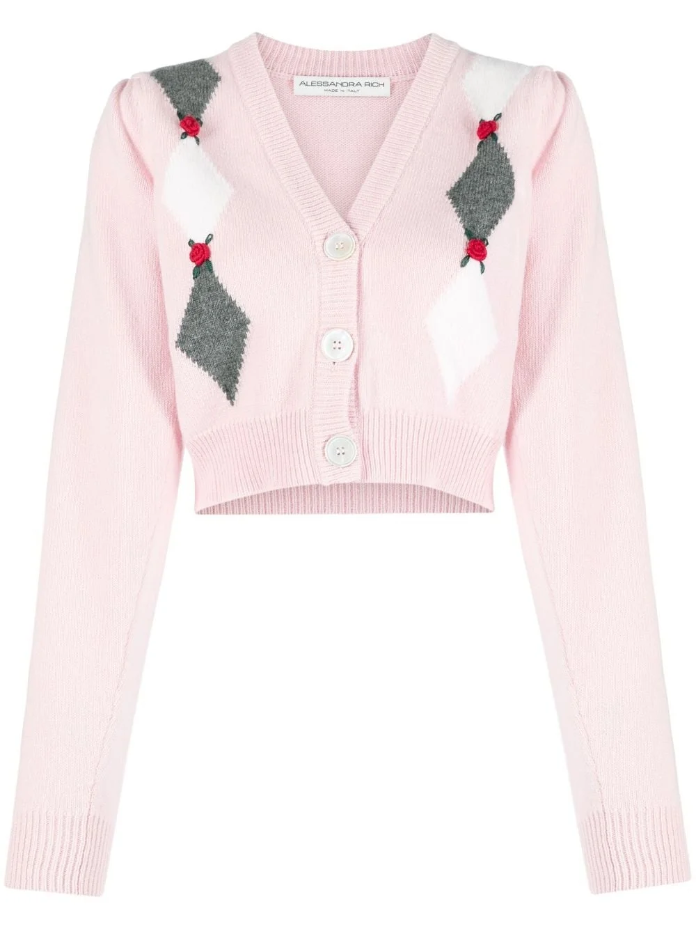 intarsia-knit floral-detail cardigan Cut to a contemporary cropped length, this cardigan from Alessandra Rich showcases the brand's signature bold aesthetic through a diamond intarsia detailing and romantic floral detailing to the front. Highlights - Blush pink/multicolour - Wool - Patterned intarsia knit - Floral detail - Mother-of-pearl button fastening - V-neck - Long sleeves - Cropped Made in Italy Composition Wool 100%, Mother of Pearl 100% SIZE & FIT Model measurements Height 5 ft 11 in(1.8 m) Bust/Chest 34.25 in(87 cm) Hips 35.82 in(91 cm) Waist 24.8 in(63 cm) Measurement LENGTH 18.11 in(46 cm) SLEEVE LENGTH 27.16 in(69 cm) FittingInformation Designed for a slim fit that sits just away from the body offering a close yet comfortable fit The ribbed hem offers a close, comfortable fit Made with a midweight knit, this piece offers some stretch This piece fits true to size – take your usual size