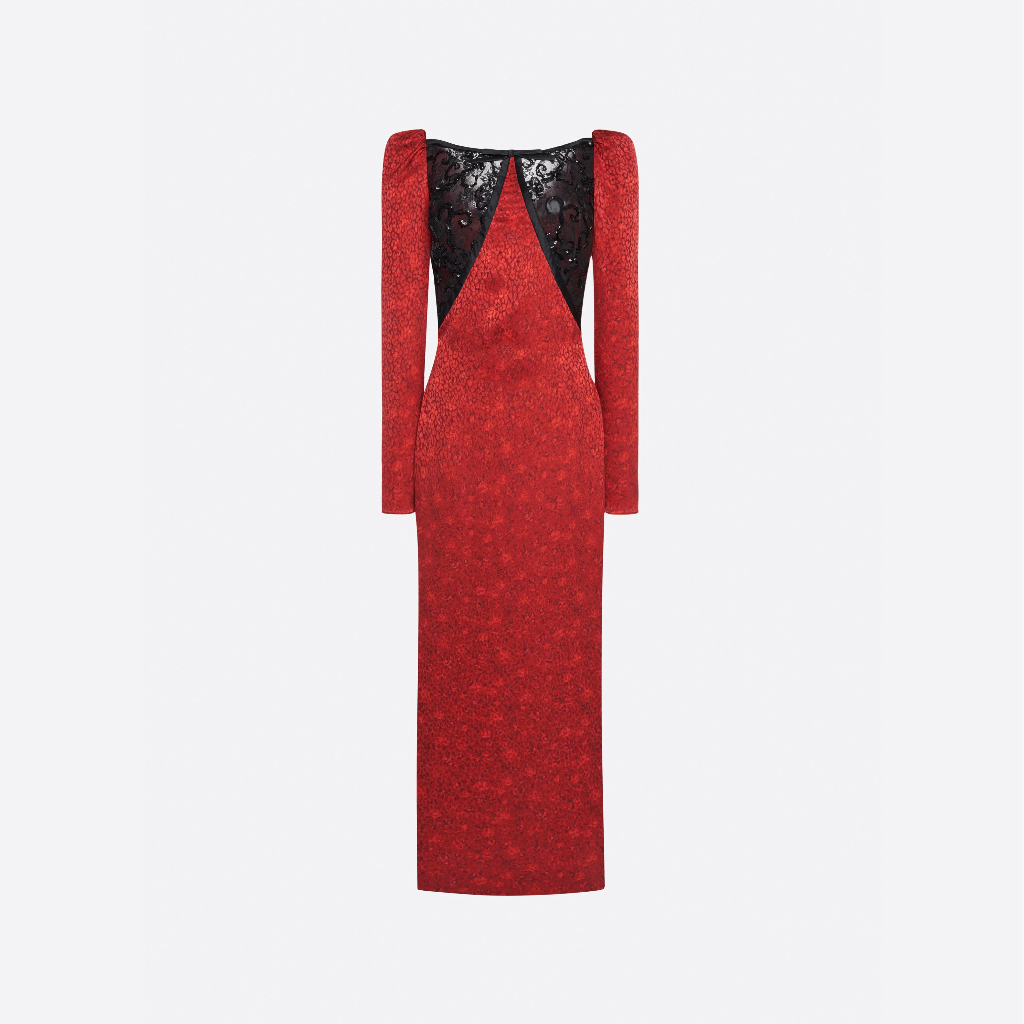 Print silk jacquard evening dress with lace Composition 100% silk Lace: 69% acetate 14% polyamide 6% cotton 6% modal 5% polyester Lining: 100% polyester Lining 2: 100% cotton Lining 3: 100% polyamide Colour: red Made in Italy Product code: FABX4318 F4670 1982