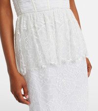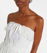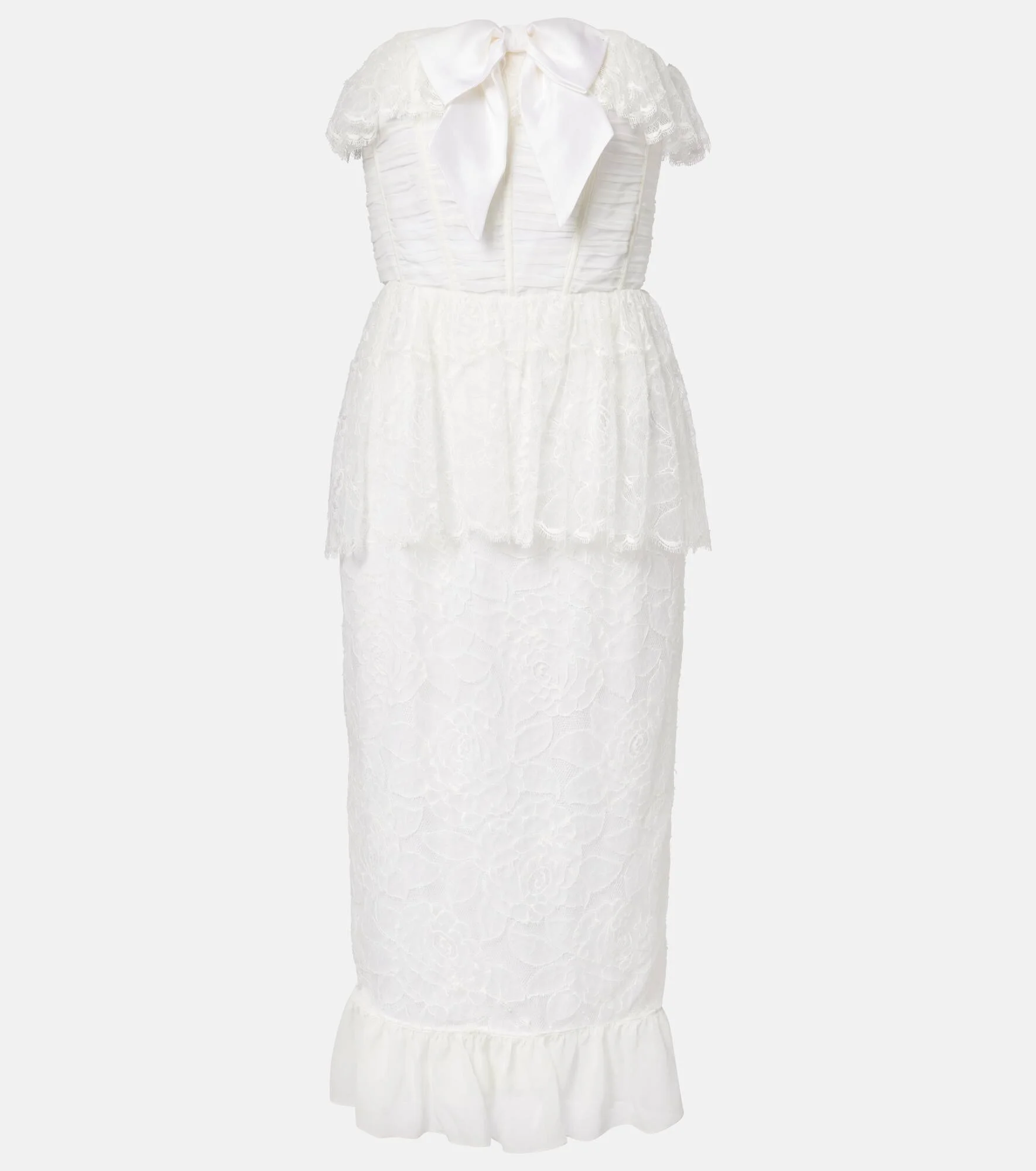 For an unforgettable look at your next special event, Alessandra Rich offers timeless pieces. This bustier dress boasts a lace and silk georgette composition, and its midi silhouette features floral embroideries, ruffled accents, and a charming bow. Product Details - Material: 50% polyamide, 50% cotton - Care instructions: dry clean - Made in Italy - Designer color name: White - Item color: white - Material II: 100% silk - Material III: 100% silk - Material IV: 78% polyamide, 22% elastane - Details: 100% mother-of-pearl - Contains non-textile parts of animal origin - Boning - Hook-fastening built-in bustier - Closure: concealed zipper, zipped back, hook-fastening back - Item number: P01051405 Size & Fit - True to size - Strapless - Internal boned corset for support - Fitted - Non-stretchy fabric - The model seen in the picture is 178cm-5'10" and wearing a size IT 40