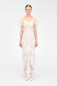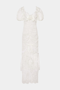 Lace dress with bow and silk organza rose Composition 65% polyamide 35% polyamide Bow: 100% silk Rose: 100% silk Ruches neck: 60% viscose 40% polyamide Ruches skirt: 40% polyamide 32% cotton 28% modal Lining: 70% acetate 25% silk 5% elastane Colour: white Made in Italy Product code: FABX4121 P4609 0822