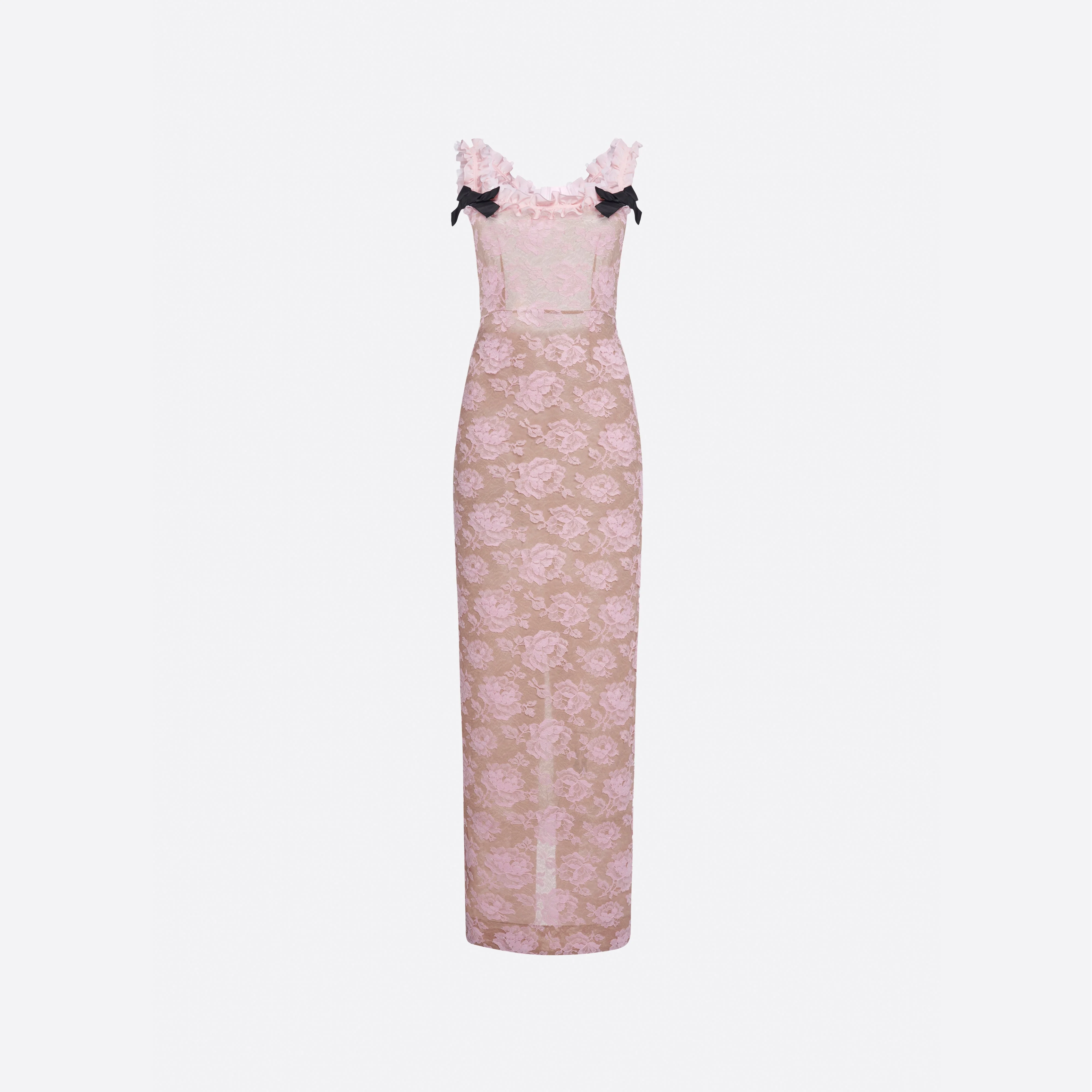 Lace evening slip dress with bows and ruffles Composition 73% cupro 27% polyamide 100% polyamide Ruffles:100% silk Bows:100% silk Lining: 100% silk Colour: pink Made in Italy Product code: FABX4266 P4167 1816