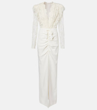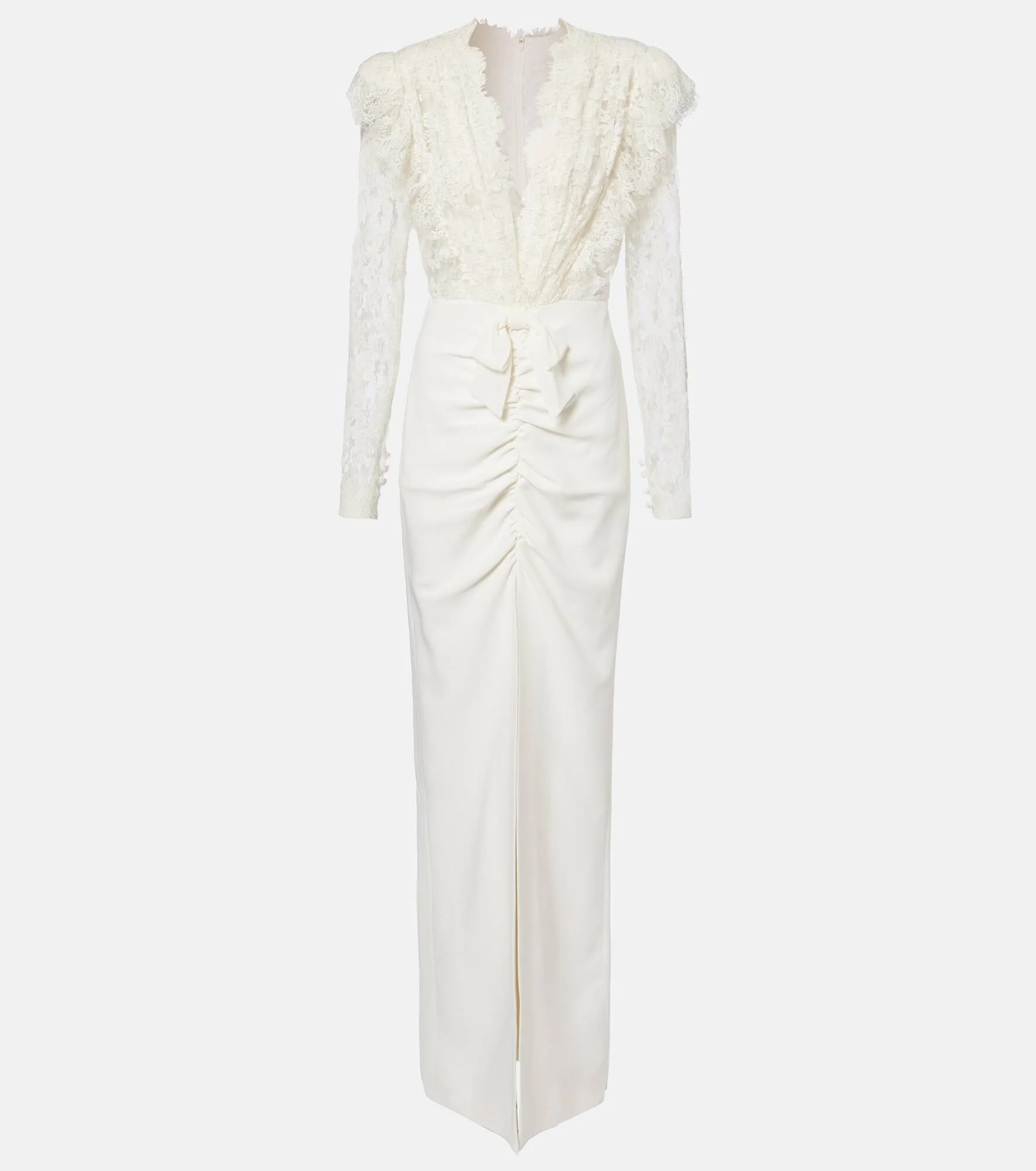 This Alessandra Rich lace gown embodies timeless romance. Designed with a plunging neckline, the bodice boasts an intricate, sheer motif, and the floor-length skirt is finished with a deep front slit. Product Details - Material: 98% viscose, 2% elastane - Care instructions: dry clean - Made in Italy - Designer color name: White - Item color: white - Material II: 65% cotton, 35% polyamide - Lining: 95% cupro, 5% elastane - Collar: V-neck - Sleeves: long-sleeved - Cuff: buttoned - Closure: concealed zipper, zipped back, hook-fastening back - Item number: P01051381 Size & Fit - True to size - Low back - Semi-sheer - Fitted - Non-stretchy fabric - The model seen in the picture is 178cm-5'10" and wearing a size IT 40