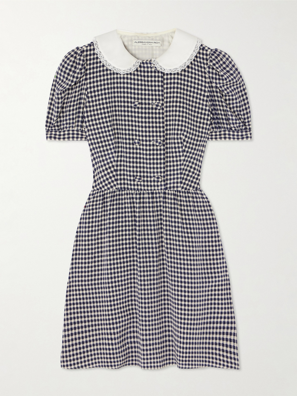 Alessandra Rich's dress recalls school pinafores, souped-up with the Italian-born, London-based designer's typical elegance. It's made from gingham silk-crepe with a cotton and silk-blend lace collar resting on the shoulders.
