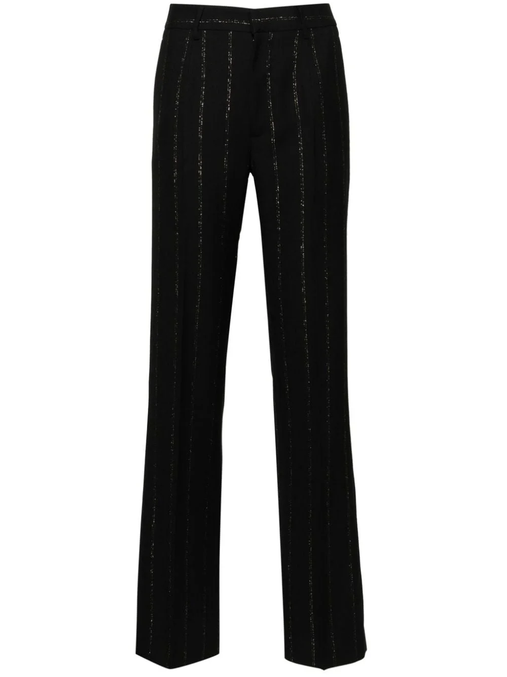 Lurex pinstriped trousers Highlights - Black - Virgin wool blend - Faille - Pinstripe pattern - Gold-tone metallic threading - Belt loops - Two side slit pockets - Two rear welt pockets - Pressed crease - Concealed front button, hook and zip fastening Made In Italy Composition Outer: Virgin Wool 94%, Polyester 6% Lining: Viscose 100% SIZE & FIT Model measurements Height 5 ft 11 in(1.8 m) Bust/Chest 31.49 in(80 cm) Hips 36.22 in(92 cm) Waist 25.59 in(65 cm) FittingInformation Designed with a flared hem, these trousers allow for a close fit at the waist with a slim fit over the leg and widening towards the hem Made from a midweight non-stretch fabric This piece fits true to size – take your usual size Washing instructions Dry Clean Only